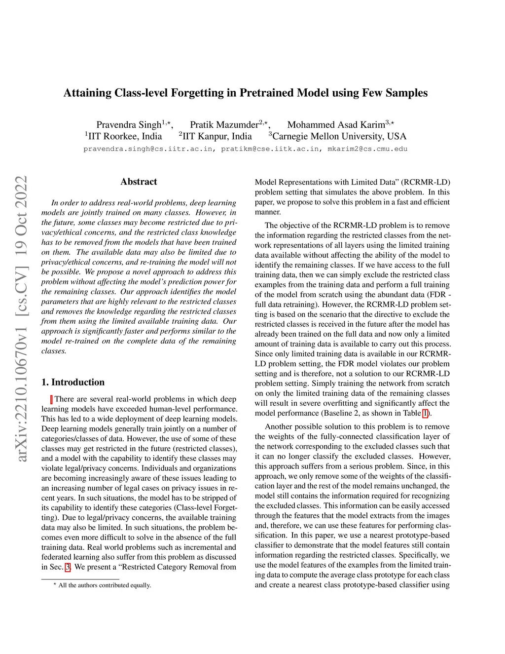 In order to address real-world problems, deep learning models are jointly trained on many classes. However, in the future, some classes may become restricted due to privacy/ethical concerns, and the restricted class knowledge has to be removed from the models that have been trained on them. The available data may also be limited due to privacy/ethical concerns, and re-training the model will not be possible. We propose a novel approach to address this problem without affecting the model's prediction power for the remaining classes. Our approach identifies the model parameters that are highly relevant to the restricted classes and removes the knowledge regarding the restricted classes from them using the limited available training data. Our approach is significantly faster and performs similar to the model re-trained on the complete data of the remaining classes.