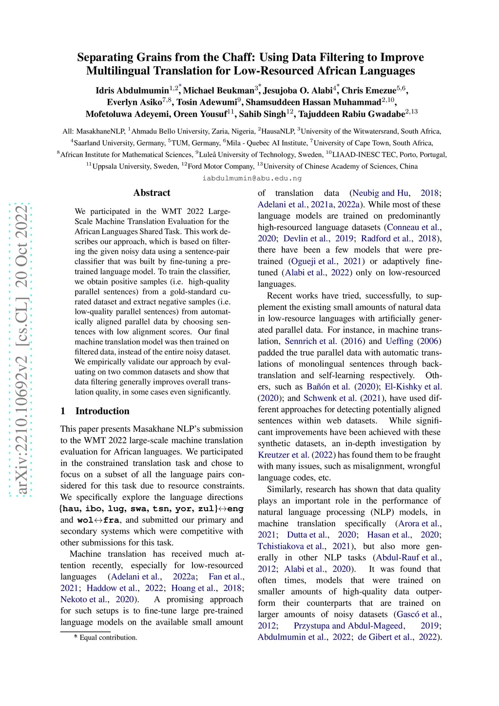 We participated in the WMT 2022 Large-Scale Machine Translation Evaluation for the African Languages Shared Task. This work describes our approach, which is based on filtering the given noisy data using a sentence-pair classifier that was built by fine-tuning a pre-trained language model. To train the classifier, we obtain positive samples (i.e. high-quality parallel sentences) from a gold-standard curated dataset and extract negative samples (i.e. low-quality parallel sentences) from automatically aligned parallel data by choosing sentences with low alignment scores. Our final machine translation model was then trained on filtered data, instead of the entire noisy dataset. We empirically validate our approach by evaluating on two common datasets and show that data filtering generally improves overall translation quality, in some cases even significantly.