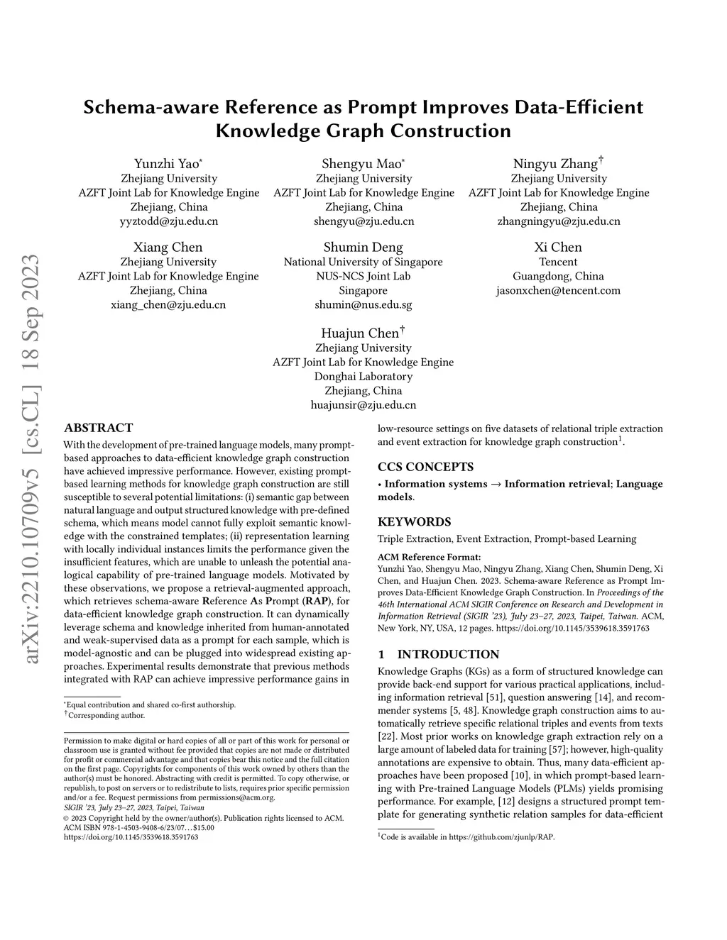 With the development of pre-trained language models, many prompt-based approaches to data-efficient knowledge graph construction have been proposed and achieved impressive performance. However, existing prompt-based learning methods for knowledge graph construction are still susceptible to several potential limitations: (i) semantic gap between natural language and output structured knowledge with pre-defined schema, which means model cannot fully exploit semantic knowledge with the constrained templates; (ii) representation learning with locally individual instances limits the performance given the insufficient features, which are unable to unleash the potential analogical capability of pre-trained language models. Motivated by these observations, we propose a retrieval-augmented approach, which retrieves schema-aware Reference As Prompt (RAP), for data-efficient knowledge graph construction. It can dynamically leverage schema and knowledge inherited from human-annotated and weak-supervised data as a prompt for each sample, which is model-agnostic and can be plugged into widespread existing approaches. Experimental results demonstrate that previous methods integrated with RAP can achieve impressive performance gains in low-resource settings on five datasets of relational triple extraction and event extraction for knowledge graph construction. Code is available in https://github.com/zjunlp/RAP.