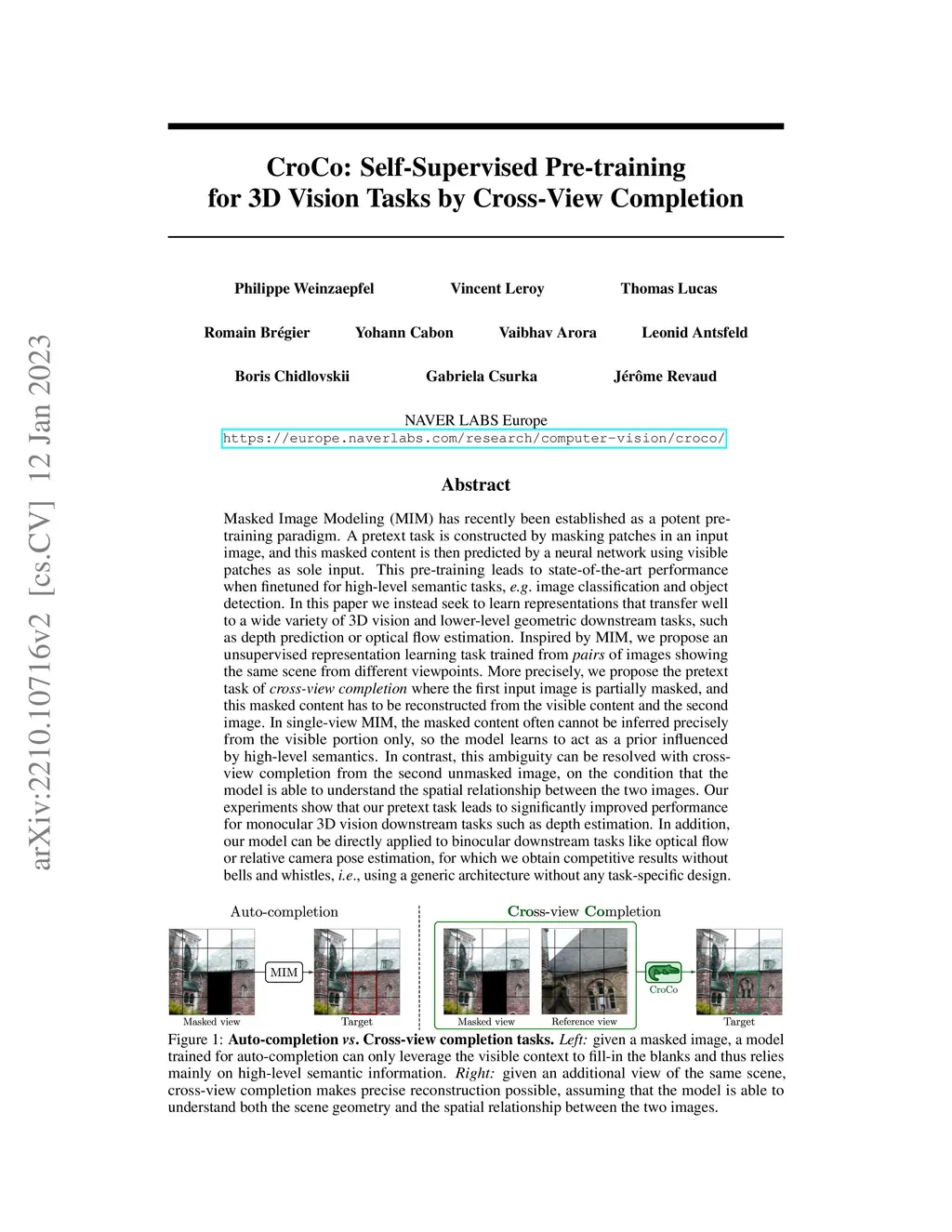 Masked Image Modeling (MIM) has recently been established as a potent pre-training paradigm. A pretext task is constructed by masking patches in an input image, and this masked content is then predicted by a neural network using visible patches as sole input. This pre-training leads to state-of-the-art performance when finetuned for high-level semantic tasks, e.g. image classification and object detection. In this paper we instead seek to learn representations that transfer well to a wide variety of 3D vision and lower-level geometric downstream tasks, such as depth prediction or optical flow estimation. Inspired by MIM, we propose an unsupervised representation learning task trained from pairs of images showing the same scene from different viewpoints. More precisely, we propose the pretext task of cross-view completion where the first input image is partially masked, and this masked content has to be reconstructed from the visible content and the second image. In single-view MIM, the masked content often cannot be inferred precisely from the visible portion only, so the model learns to act as a prior influenced by high-level semantics. In contrast, this ambiguity can be resolved with cross-view completion from the second unmasked image, on the condition that the model is able to understand the spatial relationship between the two images. Our experiments show that our pretext task leads to significantly improved performance for monocular 3D vision downstream tasks such as depth estimation. In addition, our model can be directly applied to binocular downstream tasks like optical flow or relative camera pose estimation, for which we obtain competitive results without bells and whistles, i.e., using a generic architecture without any task-specific design.