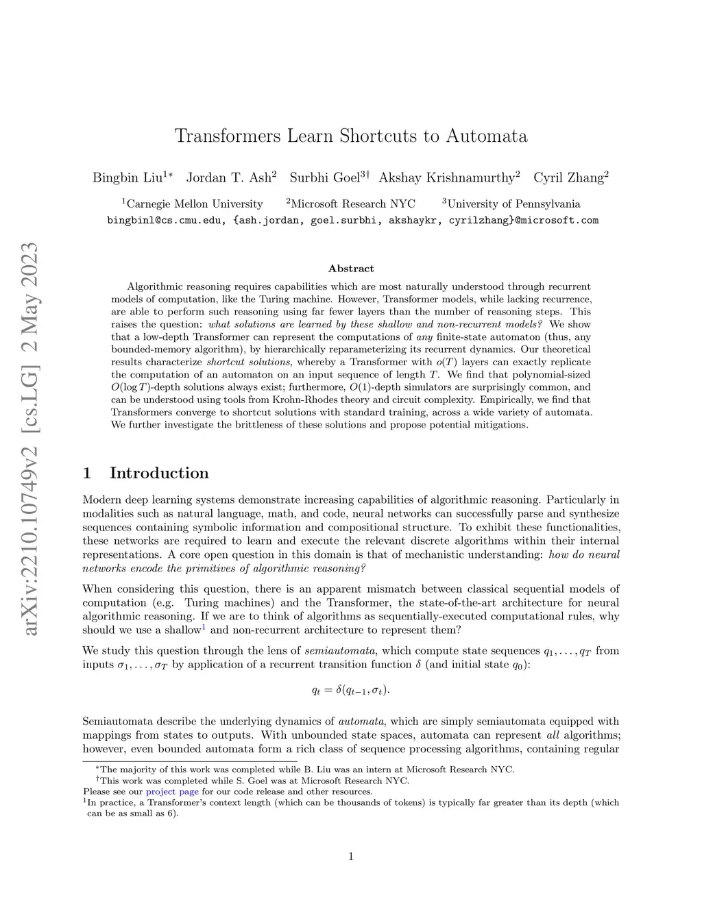 Algorithmic reasoning requires capabilities which are most naturally understood through recurrent models of computation, like the Turing machine. However, Transformer models, while lacking recurrence, are able to perform such reasoning using far fewer layers than the number of reasoning steps. This raises the question: what solutions are learned by these shallow and non-recurrent models? We find that a low-depth Transformer can represent the computations of any finite-state automaton (thus, any bounded-memory algorithm), by hierarchically reparameterizing its recurrent dynamics. Our theoretical results characterize shortcut solutions, whereby a Transformer with layers can exactly replicate the computation of an automaton on an input sequence of length . We find that polynomial-sized -depth solutions always exist; furthermore, -depth simulators are surprisingly common, and can be understood using tools from Krohn-Rhodes theory and circuit complexity. Empirically, we perform synthetic experiments by training Transformers to simulate a wide variety of automata, and show that shortcut solutions can be learned via standard training. We further investigate the brittleness of these solutions and propose potential mitigations.