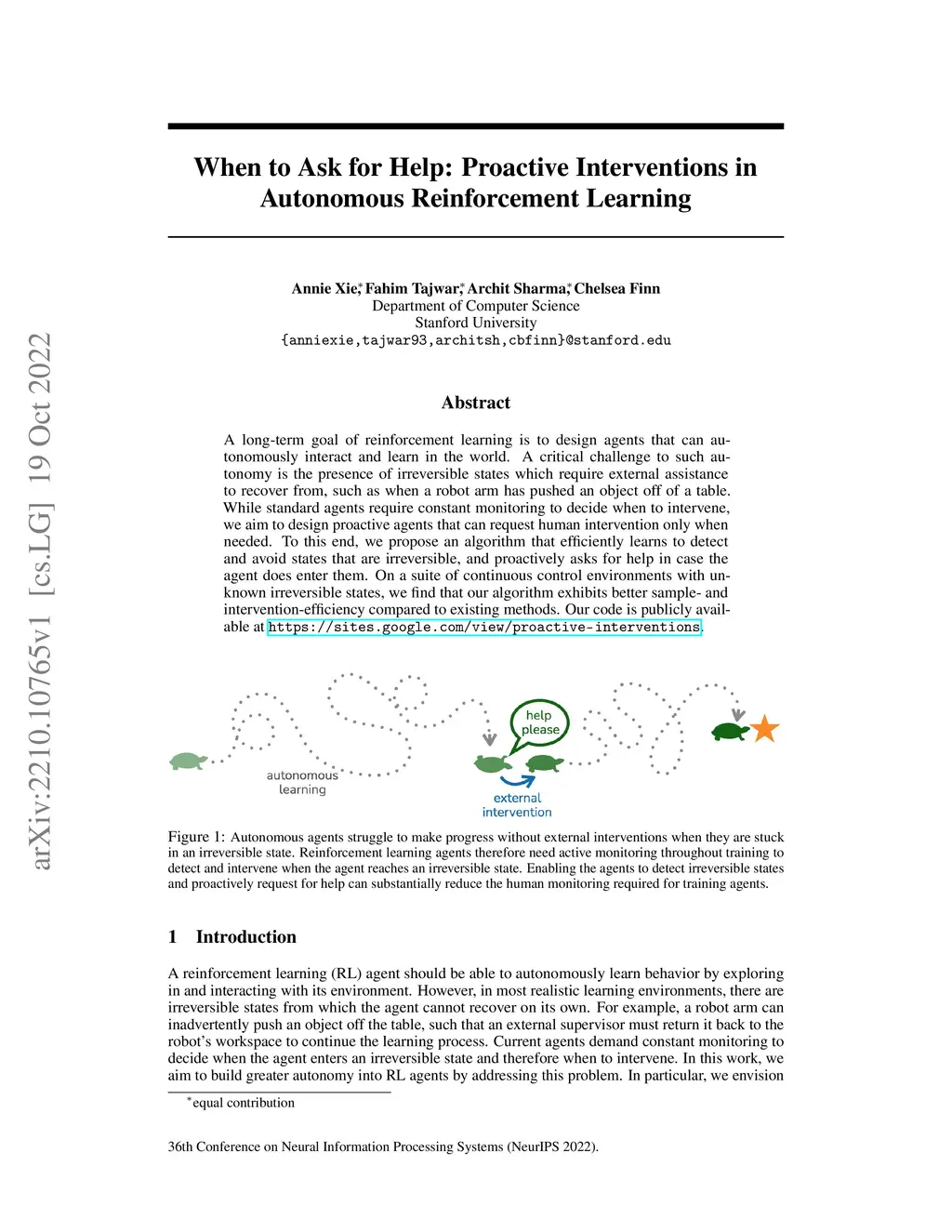A long-term goal of reinforcement learning is to design agents that can autonomously interact and learn in the world. A critical challenge to such autonomy is the presence of irreversible states which require external assistance to recover from, such as when a robot arm has pushed an object off of a table. While standard agents require constant monitoring to decide when to intervene, we aim to design proactive agents that can request human intervention only when needed. To this end, we propose an algorithm that efficiently learns to detect and avoid states that are irreversible, and proactively asks for help in case the agent does enter them. On a suite of continuous control environments with unknown irreversible states, we find that our algorithm exhibits better sample- and intervention-efficiency compared to existing methods. Our code is publicly available at https://sites.google.com/view/proactive-interventions