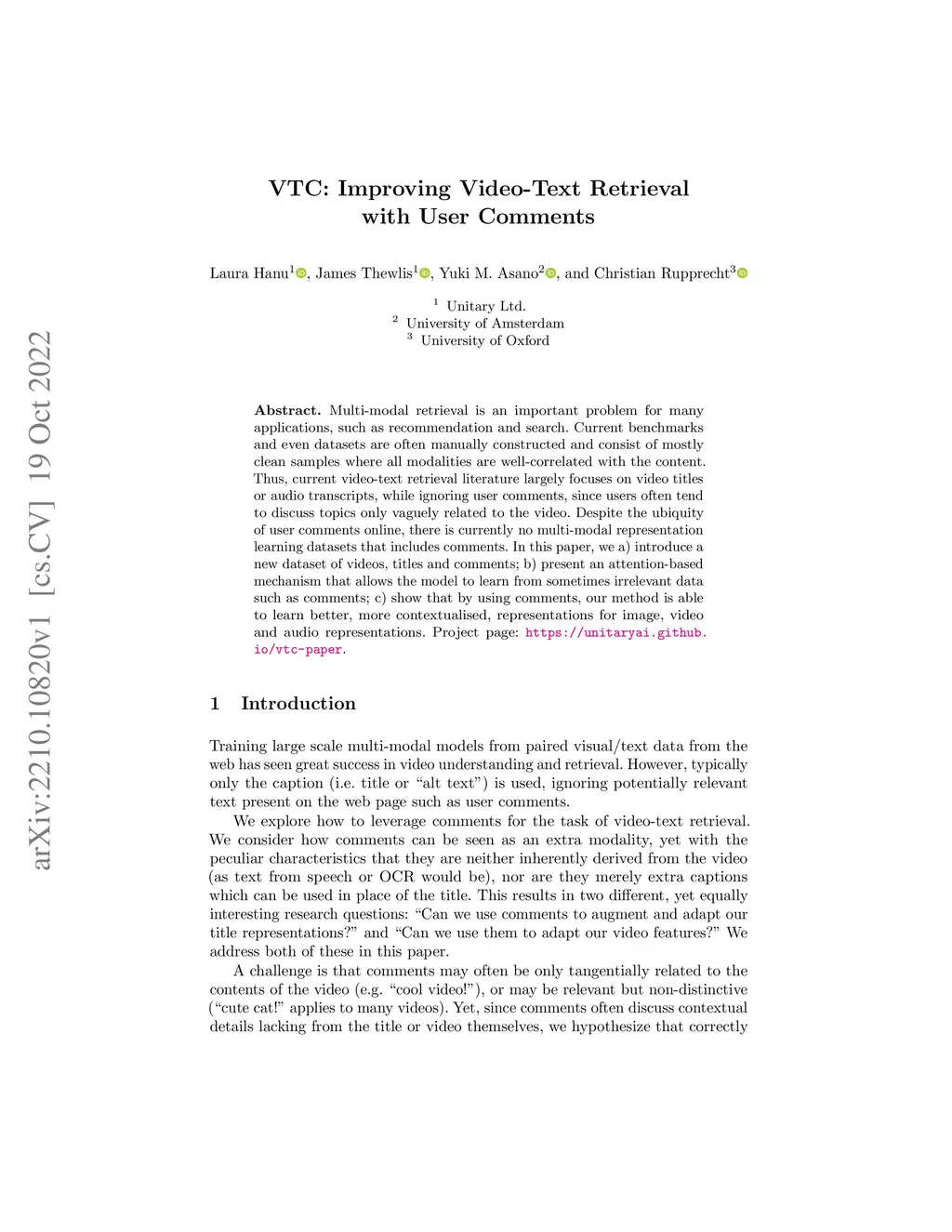 Multi-modal retrieval is an important problem for many applications, such as recommendation and search. Current benchmarks and even datasets are often manually constructed and consist of mostly clean samples where all modalities are well-correlated with the content. Thus, current video-text retrieval literature largely focuses on video titles or audio transcripts, while ignoring user comments, since users often tend to discuss topics only vaguely related to the video. Despite the ubiquity of user comments online, there is currently no multi-modal representation learning datasets that includes comments. In this paper, we a) introduce a new dataset of videos, titles and comments; b) present an attention-based mechanism that allows the model to learn from sometimes irrelevant data such as comments; c) show that by using comments, our method is able to learn better, more contextualised, representations for image, video and audio representations. Project page: https://unitaryai.github.io/vtc-paper.