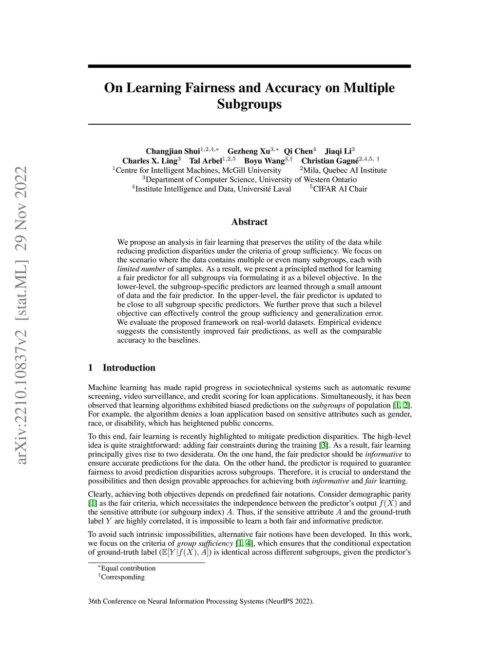 We propose an analysis in fair learning that preserves the utility of the data while reducing prediction disparities under the criteria of group sufficiency. We focus on the scenario where the data contains multiple or even many subgroups, each with limited number of samples. As a result, we present a principled method for learning a fair predictor for all subgroups via formulating it as a bilevel objective. Specifically, the subgroup specific predictors are learned in the lower-level through a small amount of data and the fair predictor. In the upper-level, the fair predictor is updated to be close to all subgroup specific predictors. We further prove that such a bilevel objective can effectively control the group sufficiency and generalization error. We evaluate the proposed framework on real-world datasets. Empirical evidence suggests the consistently improved fair predictions, as well as the comparable accuracy to the baselines.
