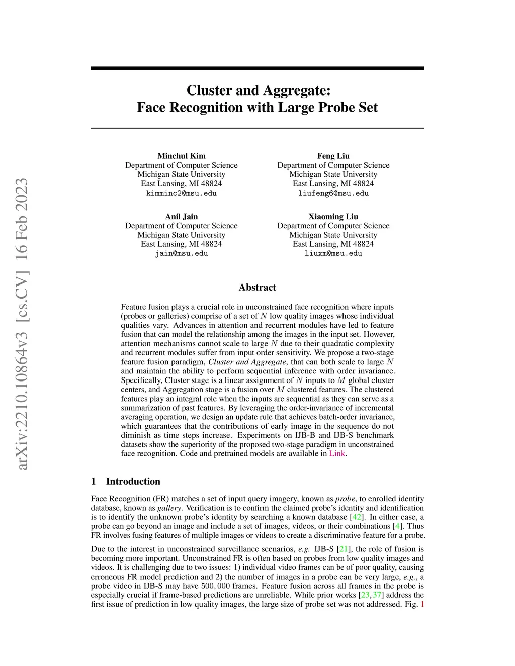 Feature fusion plays a crucial role in unconstrained face recognition where inputs (probes) comprise of a set of low quality images whose individual qualities vary. Advances in attention and recurrent modules have led to feature fusion that can model the relationship among the images in the input set. However, attention mechanisms cannot scale to large due to their quadratic complexity and recurrent modules suffer from input order sensitivity. We propose a two-stage feature fusion paradigm, Cluster and Aggregate, that can both scale to large and maintain the ability to perform sequential inference with order invariance. Specifically, Cluster stage is a linear assignment of inputs to global cluster centers, and Aggregation stage is a fusion over clustered features. The clustered features play an integral role when the inputs are sequential as they can serve as a summarization of past features. By leveraging the order-invariance of incremental averaging operation, we design an update rule that achieves batch-order invariance, which guarantees that the contributions of early image in the sequence do not diminish as time steps increase. Experiments on IJB-B and IJB-S benchmark datasets show the superiority of the proposed two-stage paradigm in unconstrained face recognition. Code and pretrained models are available in https://github.com/mk-minchul/caface