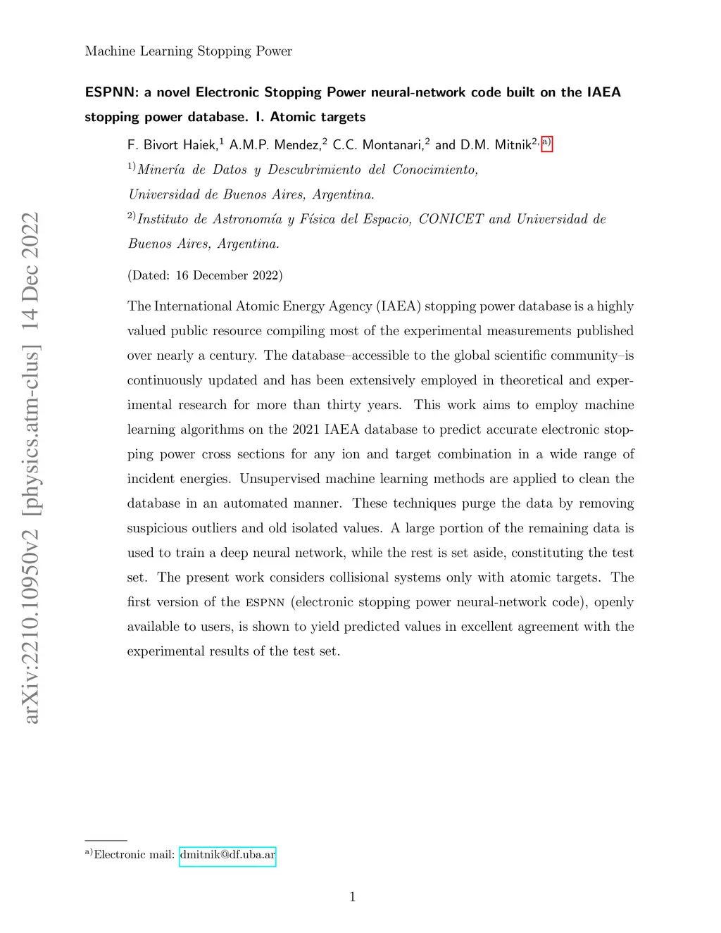 The International Atomic Energy Agency (IAEA) stopping power database is a highly valued public resource compiling most of the experimental measurements published over nearly a century. The database-accessible to the global scientific community-is continuously updated and has been extensively employed in theoretical and experimental research for more than 30 years. This work aims to employ machine learning algorithms on the 2021 IAEA database to predict accurate electronic stopping power cross sections for any ion and target combination in a wide range of incident energies. Unsupervised machine learning methods are applied to clean the database in an automated manner. These techniques purge the data by removing suspicious outliers and old isolated values. A large portion of the remaining data is used to train a deep neural network, while the rest is set aside, constituting the test set. The present work considers collisional systems only with atomic targets. The first version of the ESPNN (electronic stopping power neural-network code), openly available to users, is shown to yield predicted values in excellent agreement with the experimental results of the test set.