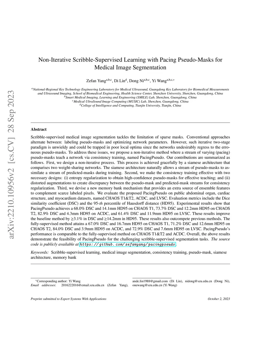 Scribble-supervised medical image segmentation tackles the limitation of sparse masks. Conventional approaches alternate between: labeling pseudo-masks and optimizing network parameters. However, such iterative two-stage paradigm is unwieldy and could be trapped in poor local optima since the networks undesirably regress to the erroneous pseudo-masks. To address these issues, we propose a non-iterative method where a stream of varying (pacing) pseudo-masks teach a network via consistency training, named PacingPseudo. Our motivation lies first in a non-iterative process. Interestingly, it can be achieved gracefully by a siamese architecture, wherein a stream of pseudo-masks naturally assimilate a stream of predicted masks during training. Second, we make the consistency training effective with two necessary designs: (i) entropy regularization to obtain high-confidence pseudo-masks for effective teaching; and (ii) distorted augmentations to create discrepancy between the pseudo-mask and predicted-mask streams for consistency regularization. Third, we devise a new memory bank mechanism that provides an extra source of ensemble features to complement scarce labeled pixels. The efficacy of the proposed PacingPseudo is validated on three public medical image datasets, including the segmentation tasks of abdominal multi-organs, cardiac structures, and myocardium. Extensive experiments demonstrate our PacingPseudo improves the baseline by large margins and consistently outcompetes several previous methods. In some cases, our PacingPseudo achieves comparable performance with its fully-supervised counterparts, showing the feasibility of our method for the challenging scribble-supervised segmentation applications. The code and scribble annotations will be publicly available.