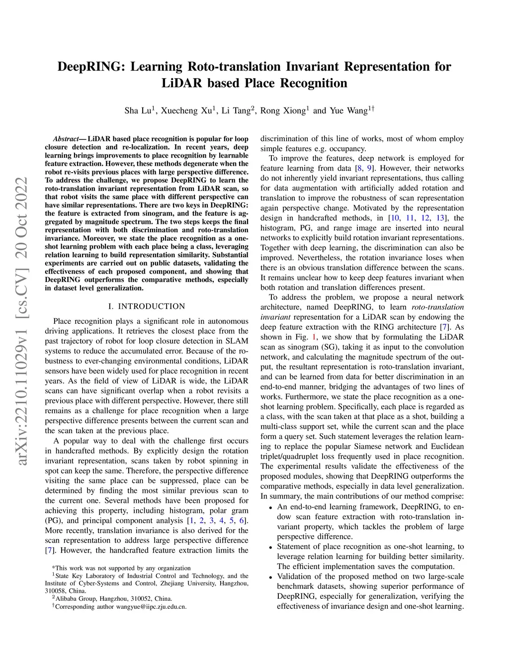 LiDAR based place recognition is popular for loop closure detection and re-localization. In recent years, deep learning brings improvements to place recognition by learnable feature extraction. However, these methods degenerate when the robot re-visits previous places with large perspective difference. To address the challenge, we propose DeepRING to learn the roto-translation invariant representation from LiDAR scan, so that robot visits the same place with different perspective can have similar representations. There are two keys in DeepRING: the feature is extracted from sinogram, and the feature is aggregated by magnitude spectrum. The two steps keeps the final representation with both discrimination and roto-translation invariance. Moreover, we state the place recognition as a one-shot learning problem with each place being a class, leveraging relation learning to build representation similarity. Substantial experiments are carried out on public datasets, validating the effectiveness of each proposed component, and showing that DeepRING outperforms the comparative methods, especially in dataset level generalization.