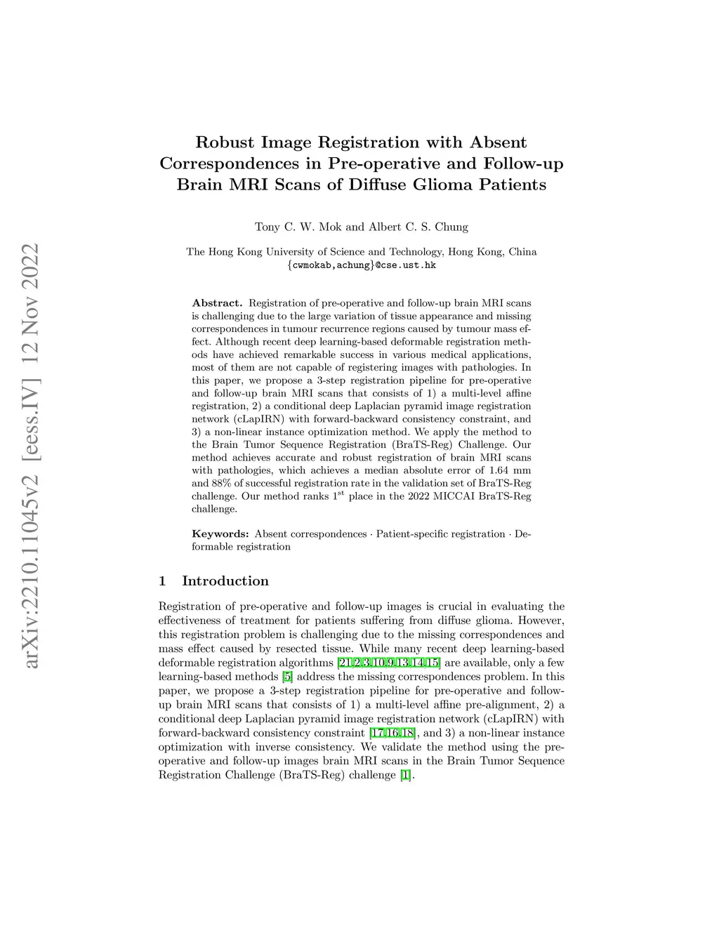 Registration of pre-operative and follow-up brain MRI scans is challenging due to the large variation of tissue appearance and missing correspondences in tumour recurrence regions caused by tumour mass effect. Although recent deep learning-based deformable registration methods have achieved remarkable success in various medical applications, most of them are not capable of registering images with pathologies. In this paper, we propose a 3-step registration pipeline for pre-operative and follow-up brain MRI scans that consists of 1) a multi-level affine registration, 2) a conditional deep Laplacian pyramid image registration network (cLapIRN) with forward-backward consistency constraint, and 3) a non-linear instance optimization method. We apply the method to the Brain Tumor Sequence Registration (BraTS-Reg) Challenge. Our method achieves accurate and robust registration of brain MRI scans with pathologies, which achieves a median absolute error of 1.64 mm and 88\% of successful registration rate in the validation set of BraTS-Reg challenge. Our method ranks 1st place in the 2022 MICCAI BraTS-Reg challenge.