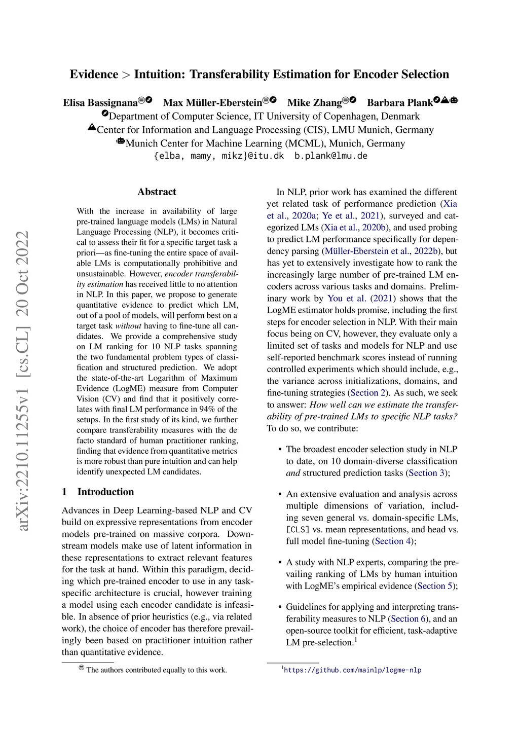 With the increase in availability of large pre-trained language models (LMs) in Natural Language Processing (NLP), it becomes critical to assess their fit for a specific target task a priori - as fine-tuning the entire space of available LMs is computationally prohibitive and unsustainable. However, encoder transferability estimation has received little to no attention in NLP. In this paper, we propose to generate quantitative evidence to predict which LM, out of a pool of models, will perform best on a target task without having to fine-tune all candidates. We provide a comprehensive study on LM ranking for 10 NLP tasks spanning the two fundamental problem types of classification and structured prediction. We adopt the state-of-the-art Logarithm of Maximum Evidence (LogME) measure from Computer Vision (CV) and find that it positively correlates with final LM performance in 94% of the setups. In the first study of its kind, we further compare transferability measures with the de facto standard of human practitioner ranking, finding that evidence from quantitative metrics is more robust than pure intuition and can help identify unexpected LM candidates.