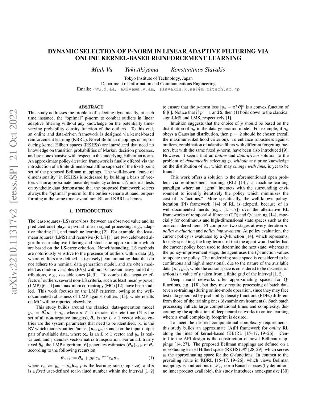 This study addresses the problem of selecting dynamically, at each time instance, the ``optimal'' p-norm to combat outliers in linear adaptive filtering without any knowledge on the potentially time-varying probability distribution function of the outliers. To this end, an online and data-driven framework is designed via kernel-based reinforcement learning (KBRL). Novel Bellman mappings on reproducing kernel Hilbert spaces (RKHSs) are introduced that need no knowledge on transition probabilities of Markov decision processes, and are nonexpansive with respect to the underlying Hilbertian norm. An approximate policy-iteration framework is finally offered via the introduction of a finite-dimensional affine superset of the fixed-point set of the proposed Bellman mappings. The well-known ``curse of dimensionality'' in RKHSs is addressed by building a basis of vectors via an approximate linear dependency criterion. Numerical tests on synthetic data demonstrate that the proposed framework selects always the ``optimal'' p-norm for the outlier scenario at hand, outperforming at the same time several non-RL and KBRL schemes.