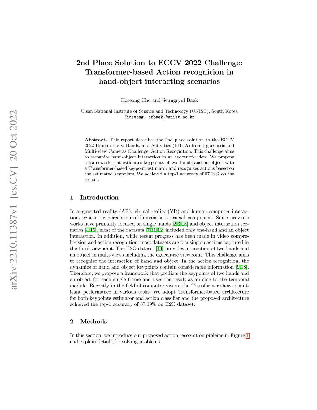 This report describes the 2nd place solution to the ECCV 2022 Human Body, Hands, and Activities (HBHA) from Egocentric and Multi-view Cameras Challenge: Action Recognition. This challenge aims to recognize hand-object interaction in an egocentric view. We propose a framework that estimates keypoints of two hands and an object with a Transformer-based keypoint estimator and recognizes actions based on the estimated keypoints. We achieved a top-1 accuracy of 87.19% on the testset.