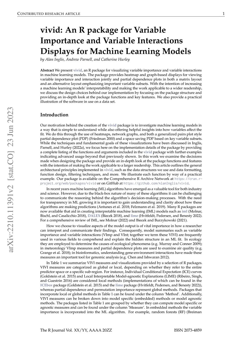 We present vivid, an R package for visualizing variable importance and variable interactions in machine learning models. The package provides a range of displays including heatmap and graph-based displays for viewing variable importance and interaction jointly and partial dependence plots in both a matrix layout and an alternative layout emphasizing important variable subsets. With the intention of increasing a machine learning models' interpretability and making the work applicable to a wider readership, we discuss the design choices behind our implementation by focusing on the package structure and providing an in-depth look at the package functions and key features. We also provide a practical illustration of the software in use on a data set.