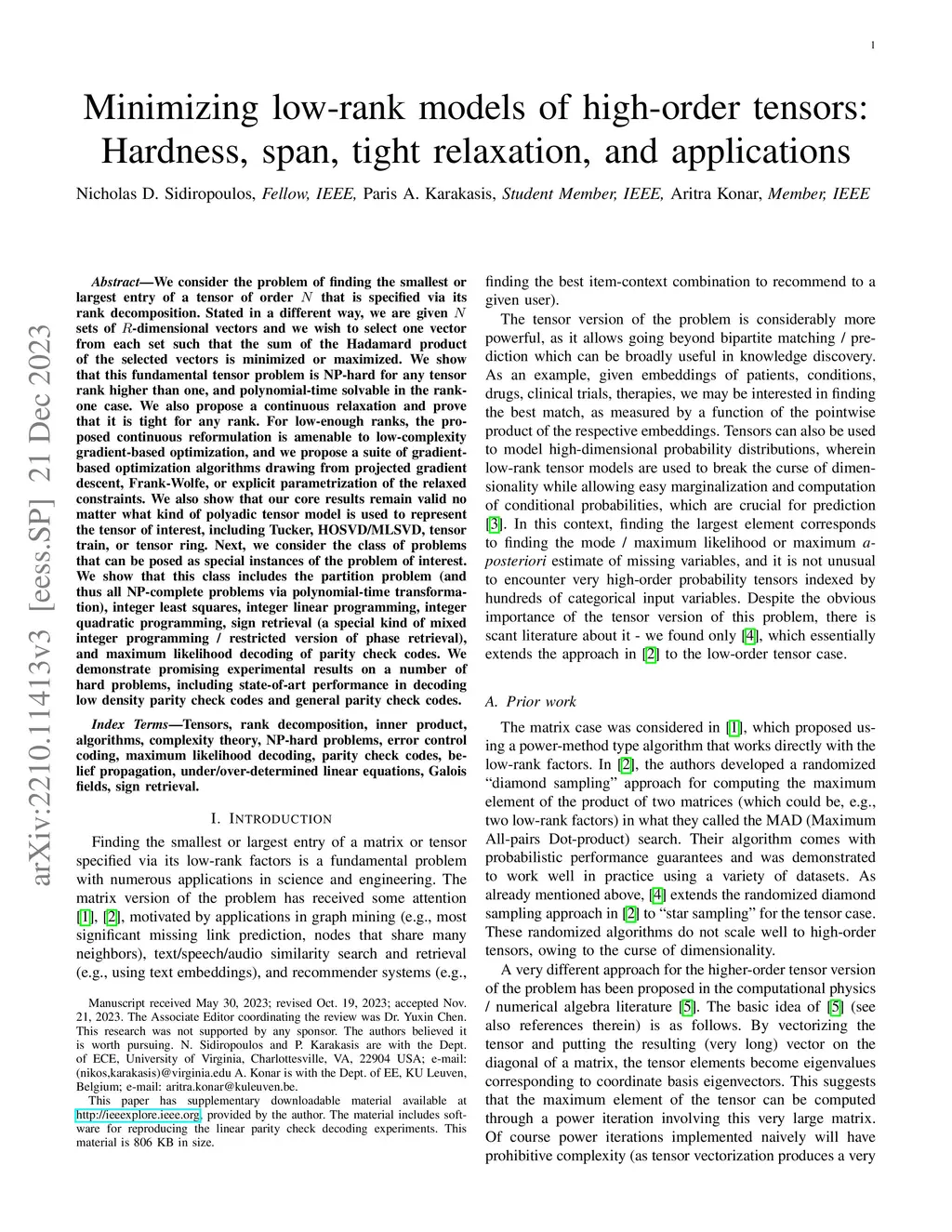 We consider the problem of finding the smallest or largest entry of a tensor of order N that is specified via its rank decomposition. Stated in a different way, we are given N sets of R-dimensional vectors and we wish to select one vector from each set such that the sum of the Hadamard product of the selected vectors is minimized or maximized. We show that this fundamental tensor problem is NP-hard for any tensor rank higher than one, and polynomial-time solvable in the rank-one case. We also propose a continuous relaxation and prove that it is tight for any rank. For low-enough ranks, the proposed continuous reformulation is amenable to low-complexity gradient-based optimization, and we propose a suite of gradient-based optimization algorithms drawing from projected gradient descent, Frank-Wolfe, or explicit parametrization of the relaxed constraints. We also show that our core results remain valid no matter what kind of polyadic tensor model is used to represent the tensor of interest, including Tucker, HOSVD/MLSVD, tensor train, or tensor ring. Next, we consider the class of problems that can be posed as special instances of the problem of interest. We show that this class includes the partition problem (and thus all NP-complete problems via polynomial-time transformation), integer least squares, integer linear programming, integer quadratic programming, sign retrieval (a special kind of mixed integer programming / restricted version of phase retrieval), and maximum likelihood decoding of parity check codes. We demonstrate promising experimental results on a number of hard problems, including state-of-art performance in decoding low density parity check codes and general parity check codes.