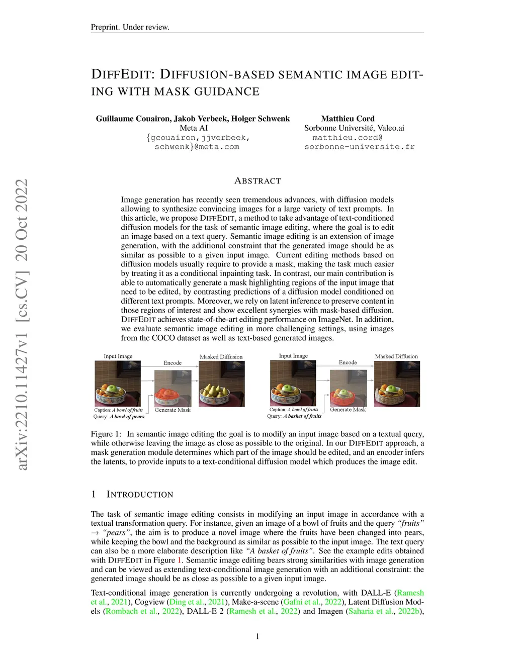Image generation has recently seen tremendous advances, with diffusion models allowing to synthesize convincing images for a large variety of text prompts. In this article, we propose DiffEdit, a method to take advantage of text-conditioned diffusion models for the task of semantic image editing, where the goal is to edit an image based on a text query. Semantic image editing is an extension of image generation, with the additional constraint that the generated image should be as similar as possible to a given input image. Current editing methods based on diffusion models usually require to provide a mask, making the task much easier by treating it as a conditional inpainting task. In contrast, our main contribution is able to automatically generate a mask highlighting regions of the input image that need to be edited, by contrasting predictions of a diffusion model conditioned on different text prompts. Moreover, we rely on latent inference to preserve content in those regions of interest and show excellent synergies with mask-based diffusion. DiffEdit achieves state-of-the-art editing performance on ImageNet. In addition, we evaluate semantic image editing in more challenging settings, using images from the COCO dataset as well as text-based generated images.