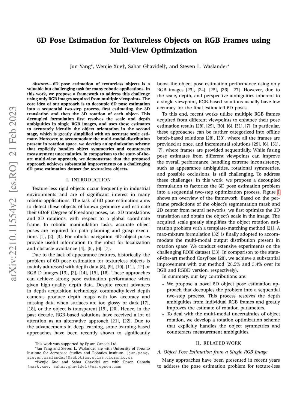 6D pose estimation of textureless objects is a valuable but challenging task for many robotic applications. In this work, we propose a framework to address this challenge using only RGB images acquired from multiple viewpoints. The core idea of our approach is to decouple 6D pose estimation into a sequential two-step process, first estimating the 3D translation and then the 3D rotation of each object. This decoupled formulation first resolves the scale and depth ambiguities in single RGB images, and uses these estimates to accurately identify the object orientation in the second stage, which is greatly simplified with an accurate scale estimate. Moreover, to accommodate the multi-modal distribution present in rotation space, we develop an optimization scheme that explicitly handles object symmetries and counteracts measurement uncertainties. In comparison to the state-of-the-art multi-view approach, we demonstrate that the proposed approach achieves substantial improvements on a challenging 6D pose estimation dataset for textureless objects.