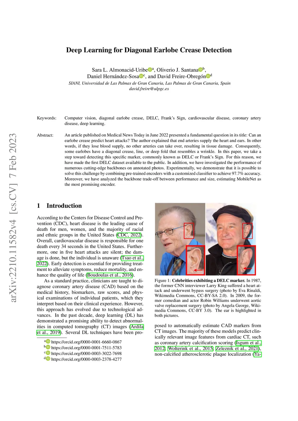 An article published on Medical News Today in June 2022 presented a fundamental question in its title: Can an earlobe crease predict heart attacks? The author explained that end arteries supply the heart and ears. In other words, if they lose blood supply, no other arteries can take over, resulting in tissue damage. Consequently, some earlobes have a diagonal crease, line, or deep fold that resembles a wrinkle. In this paper, we take a step toward detecting this specific marker, commonly known as DELC or Frank's Sign. For this reason, we have made the first DELC dataset available to the public. In addition, we have investigated the performance of numerous cutting-edge backbones on annotated photos. Experimentally, we demonstrate that it is possible to solve this challenge by combining pre-trained encoders with a customized classifier to achieve 97.7% accuracy. Moreover, we have analyzed the backbone trade-off between performance and size, estimating MobileNet as the most promising encoder.