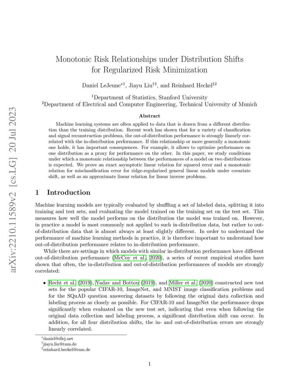 Machine learning systems are often applied to data that is drawn from a different distribution than the training distribution. Recent work has shown that for a variety of classification and signal reconstruction problems, the out-of-distribution performance is strongly linearly correlated with the in-distribution performance. If this relationship or more generally a monotonic one holds, it has important consequences. For example, it allows to optimize performance on one distribution as a proxy for performance on the other. In this paper, we study conditions under which a monotonic relationship between the performances of a model on two distributions is expected. We prove an exact asymptotic linear relation for squared error and a monotonic relation for misclassification error for ridge-regularized general linear models under covariate shift, as well as an approximate linear relation for linear inverse problems.