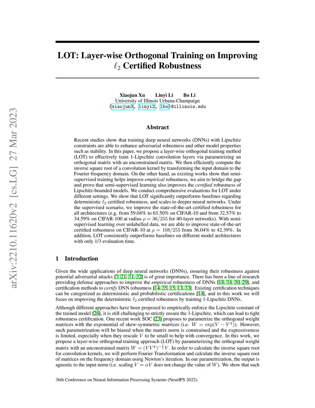 Recent studies show that training deep neural networks (DNNs) with Lipschitz constraints are able to enhance adversarial robustness and other model properties such as stability. In this paper, we propose a layer-wise orthogonal training method (LOT) to effectively train 1-Lipschitz convolution layers via parametrizing an orthogonal matrix with an unconstrained matrix. We then efficiently compute the inverse square root of a convolution kernel by transforming the input domain to the Fourier frequency domain. On the other hand, as existing works show that semi-supervised training helps improve empirical robustness, we aim to bridge the gap and prove that semi-supervised learning also improves the certified robustness of Lipschitz-bounded models. We conduct comprehensive evaluations for LOT under different settings. We show that LOT significantly outperforms baselines regarding deterministic l2 certified robustness, and scales to deeper neural networks. Under the supervised scenario, we improve the state-of-the-art certified robustness for all architectures (e.g. from 59.04% to 63.50% on CIFAR-10 and from 32.57% to 34.59% on CIFAR-100 at radius rho = 36/255 for 40-layer networks). With semi-supervised learning over unlabelled data, we are able to improve state-of-the-art certified robustness on CIFAR-10 at rho = 108/255 from 36.04% to 42.39%. In addition, LOT consistently outperforms baselines on different model architectures with only 1/3 evaluation time.