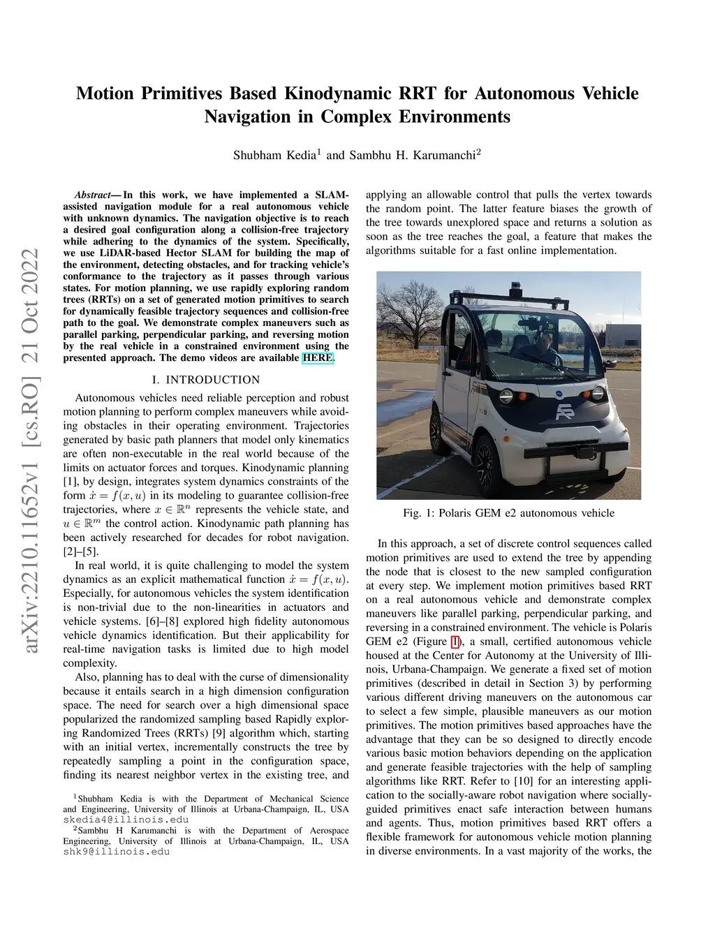 In this work, we have implemented a SLAM-assisted navigation module for a real autonomous vehicle with unknown dynamics. The navigation objective is to reach a desired goal configuration along a collision-free trajectory while adhering to the dynamics of the system. Specifically, we use LiDAR-based Hector SLAM for building the map of the environment, detecting obstacles, and for tracking vehicle's conformance to the trajectory as it passes through various states. For motion planning, we use rapidly exploring random trees (RRTs) on a set of generated motion primitives to search for dynamically feasible trajectory sequences and collision-free path to the goal. We demonstrate complex maneuvers such as parallel parking, perpendicular parking, and reversing motion by the real vehicle in a constrained environment using the presented approach.
