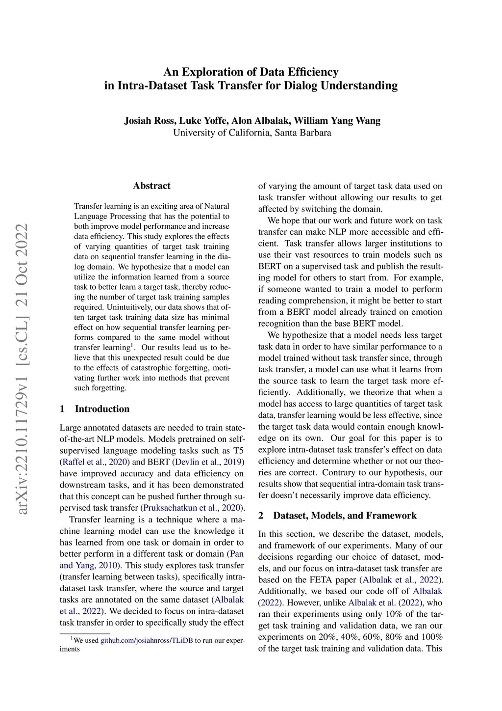 Transfer learning is an exciting area of Natural Language Processing that has the potential to both improve model performance and increase data efficiency. This study explores the effects of varying quantities of target task training data on sequential transfer learning in the dialog domain. We hypothesize that a model can utilize the information learned from a source task to better learn a target task, thereby reducing the number of target task training samples required. Unintuitively, our data shows that often target task training data size has minimal effect on how sequential transfer learning performs compared to the same model without transfer learning. Our results lead us to believe that this unexpected result could be due to the effects of catastrophic forgetting, motivating further work into methods that prevent such forgetting.