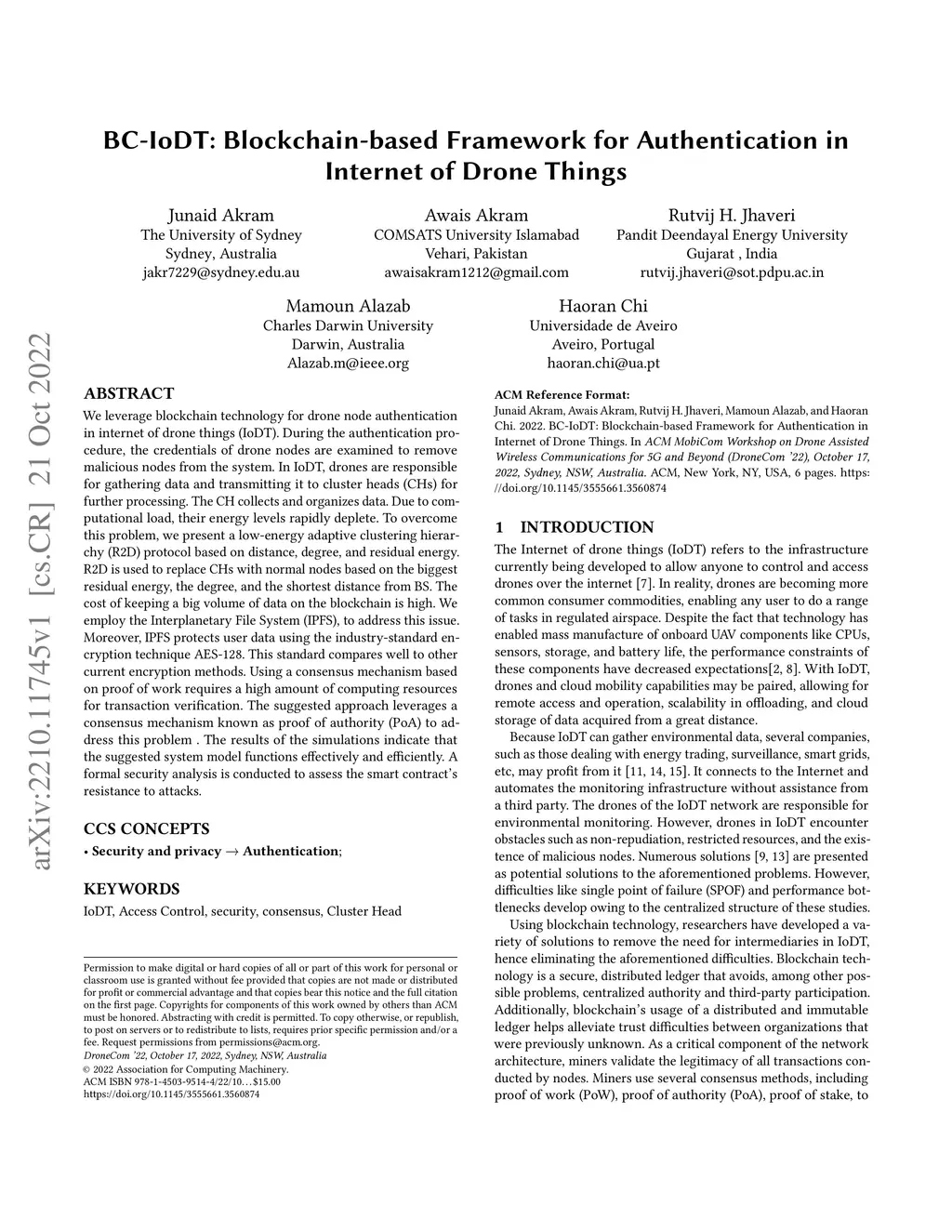 We leverage blockchain technology for drone node authentication in internet of drone things (IoDT). During the authentication procedure, the credentials of drone nodes are examined to remove malicious nodes from the system. In IoDT, drones are responsible for gathering data and transmitting it to cluster heads (CHs) for further processing. The CH collects and organizes data. Due to computational load, their energy levels rapidly deplete. To overcome this problem, we present a low-energy adaptive clustering hierarchy (R2D) protocol based on distance, degree, and residual energy. R2D is used to replace CHs with normal nodes based on the biggest residual energy, the degree, and the shortest distance from BS. The cost of keeping a big volume of data on the blockchain is high. We employ the Interplanetary File System (IPFS), to address this issue. Moreover, IPFS protects user data using the industry-standard encryption technique AES-128. This standard compares well to other current encryption methods. Using a consensus mechanism based on proof of work requires a high amount of computing resources for transaction verification. The suggested approach leverages a consensus mechanism known as proof of authority (PoA) to address this problem . The results of the simulations indicate that the suggested system model functions effectively and efficiently. A formal security analysis is conducted to assess the smart contract's resistance to attacks.