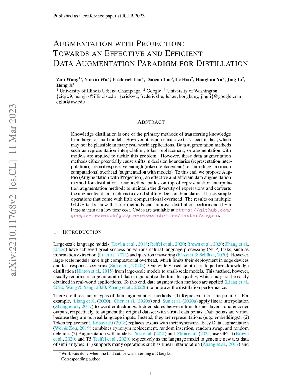 Knowledge distillation is one of the primary methods of transferring knowledge from large to small models. However, it requires massive task-specific data, which may not be plausible in many real-world applications. Data augmentation methods such as representation interpolation, token replacement, or augmentation with models are applied to tackle this problem. However, these data augmentation methods either potentially cause shifts in decision boundaries (representation interpolation), are not expressive enough (token replacement), or introduce too much computational overhead (augmentation with models). To this end, we propose AugPro (Augmentation with Projection), an effective and efficient data augmentation method for distillation. Our method builds on top of representation interpolation augmentation methods to maintain the diversity of expressions and converts the augmented data to tokens to avoid shifting decision boundaries. It uses simple operations that come with little computational overhead. The results on multiple GLUE tasks show that our methods can improve distillation performance by a large margin at a low time cost. Codes are available at https://github.com/google-research/google-research/tree/master/augpro.
