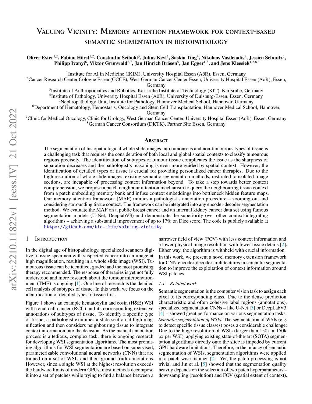 The segmentation of histopathological whole slide images into tumourous and non-tumourous types of tissue is a challenging task that requires the consideration of both local and global spatial contexts to classify tumourous regions precisely. The identification of subtypes of tumour tissue complicates the issue as the sharpness of separation decreases and the pathologist's reasoning is even more guided by spatial context. However, the identification of detailed types of tissue is crucial for providing personalized cancer therapies. Due to the high resolution of whole slide images, existing semantic segmentation methods, restricted to isolated image sections, are incapable of processing context information beyond. To take a step towards better context comprehension, we propose a patch neighbour attention mechanism to query the neighbouring tissue context from a patch embedding memory bank and infuse context embeddings into bottleneck hidden feature maps. Our memory attention framework (MAF) mimics a pathologist's annotation procedure -- zooming out and considering surrounding tissue context. The framework can be integrated into any encoder-decoder segmentation method. We evaluate the MAF on a public breast cancer and an internal kidney cancer data set using famous segmentation models (U-Net, DeeplabV3) and demonstrate the superiority over other context-integrating algorithms -- achieving a substantial improvement of up to on Dice score. The code is publicly available at: https://github.com/tio-ikim/valuing-vicinity