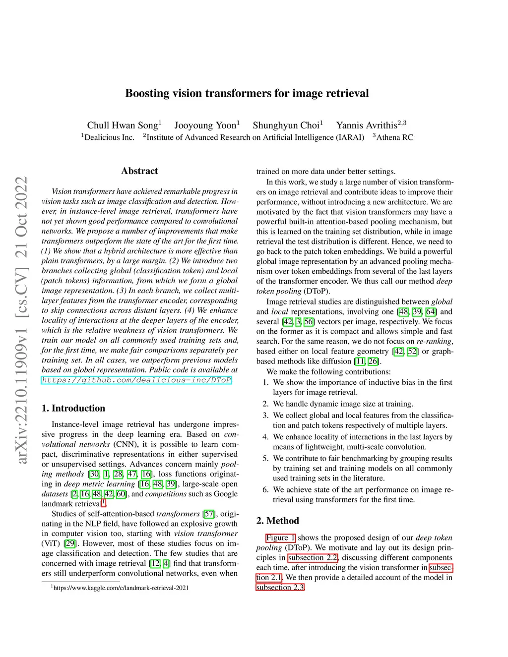 Vision transformers have achieved remarkable progress in vision tasks such as image classification and detection. However, in instance-level image retrieval, transformers have not yet shown good performance compared to convolutional networks. We propose a number of improvements that make transformers outperform the state of the art for the first time. (1) We show that a hybrid architecture is more effective than plain transformers, by a large margin. (2) We introduce two branches collecting global (classification token) and local (patch tokens) information, from which we form a global image representation. (3) In each branch, we collect multi-layer features from the transformer encoder, corresponding to skip connections across distant layers. (4) We enhance locality of interactions at the deeper layers of the encoder, which is the relative weakness of vision transformers. We train our model on all commonly used training sets and, for the first time, we make fair comparisons separately per training set. In all cases, we outperform previous models based on global representation. Public code is available at https://github.com/dealicious-inc/DToP.