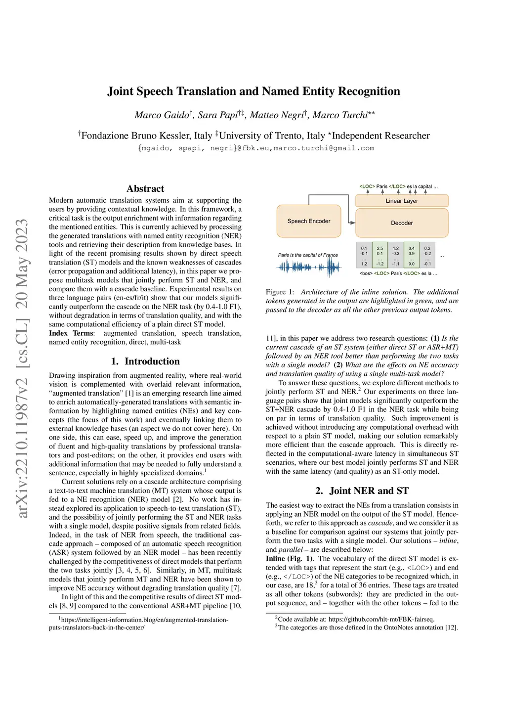 Modern automatic translation systems aim at place the human at the center by providing contextual support and knowledge. In this context, a critical task is enriching the output with information regarding the mentioned entities, which is currently achieved processing the generated translation with named entity recognition (NER) and entity linking systems. In light of the recent promising results shown by direct speech translation (ST) models and the known weaknesses of cascades (error propagation and additional latency), in this paper we propose multitask models that jointly perform ST and NER, and compare them with a cascade baseline. The experimental results show that our models significantly outperform the cascade on the NER task (by 0.4-1.0 F1), without degradation in terms of translation quality, and with the same computational efficiency of a plain direct ST model.