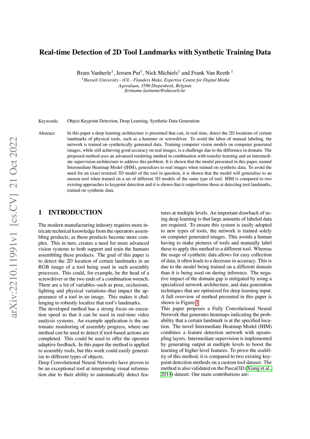In this paper a deep learning architecture is presented that can, in real time, detect the 2D locations of certain landmarks of physical tools, such as a hammer or screwdriver. To avoid the labor of manual labeling, the network is trained on synthetically generated data. Training computer vision models on computer generated images, while still achieving good accuracy on real images, is a challenge due to the difference in domain. The proposed method uses an advanced rendering method in combination with transfer learning and an intermediate supervision architecture to address this problem. It is shown that the model presented in this paper, named Intermediate Heatmap Model (IHM), generalizes to real images when trained on synthetic data. To avoid the need for an exact textured 3D model of the tool in question, it is shown that the model will generalize to an unseen tool when trained on a set of different 3D models of the same type of tool. IHM is compared to two existing approaches to keypoint detection and it is shown that it outperforms those at detecting tool landmarks, trained on synthetic data.