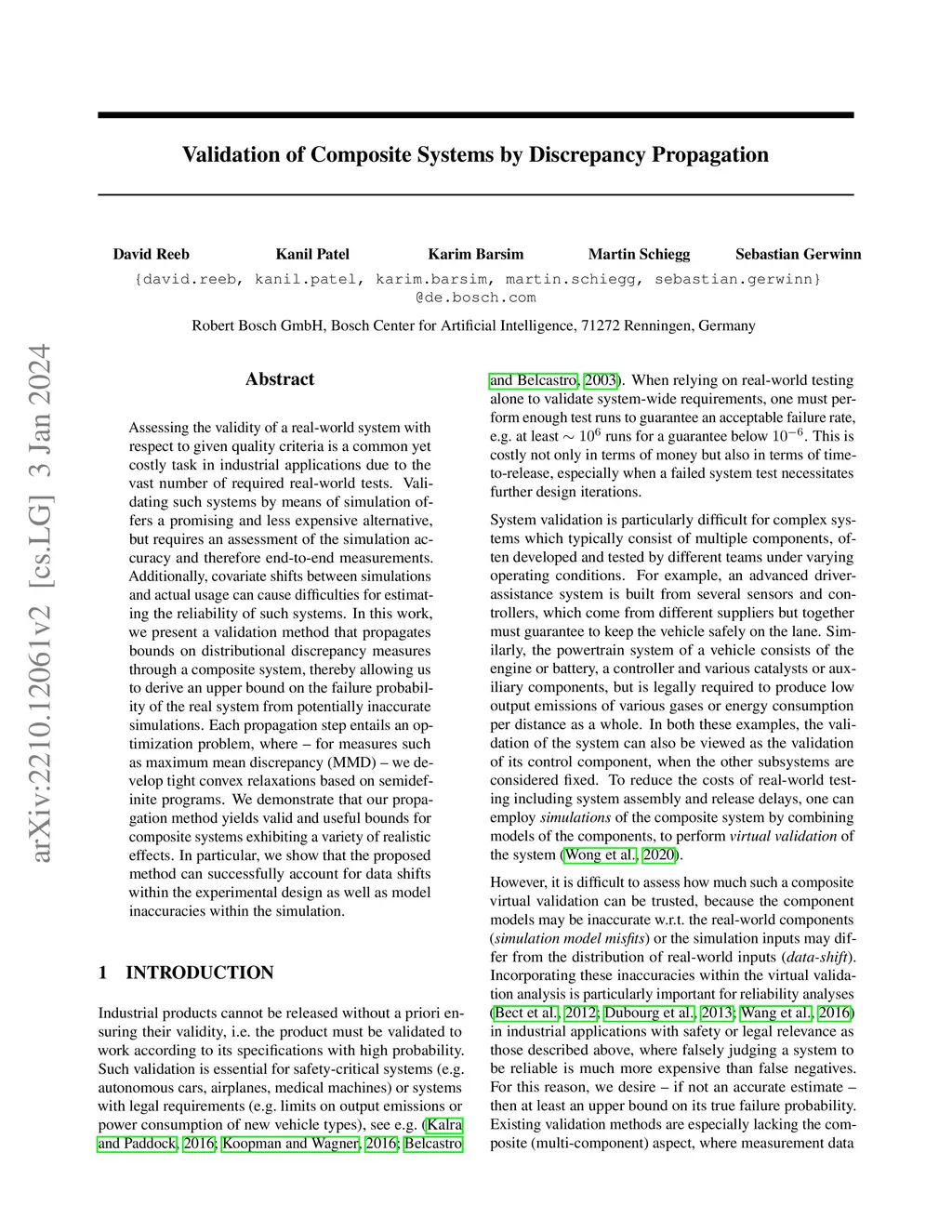 Assessing the validity of a real-world system with respect to given quality criteria is a common yet costly task in industrial applications due to the vast number of required real-world tests. Validating such systems by means of simulation offers a promising and less expensive alternative, but requires an assessment of the simulation accuracy and therefore end-to-end measurements. Additionally, covariate shifts between simulations and actual usage can cause difficulties for estimating the reliability of such systems. In this work, we present a validation method that propagates bounds on distributional discrepancy measures through a composite system, thereby allowing us to derive an upper bound on the failure probability of the real system from potentially inaccurate simulations. Each propagation step entails an optimization problem, where -- for measures such as maximum mean discrepancy (MMD) -- we develop tight convex relaxations based on semidefinite programs. We demonstrate that our propagation method yields valid and useful bounds for composite systems exhibiting a variety of realistic effects. In particular, we show that the proposed method can successfully account for data shifts within the experimental design as well as model inaccuracies within the used simulation.
