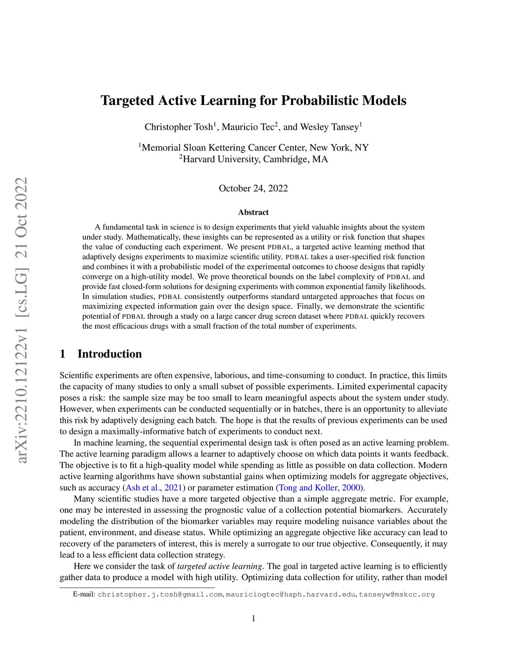 A fundamental task in science is to design experiments that yield valuable insights about the system under study. Mathematically, these insights can be represented as a utility or risk function that shapes the value of conducting each experiment. We present PDBAL, a targeted active learning method that adaptively designs experiments to maximize scientific utility. PDBAL takes a user-specified risk function and combines it with a probabilistic model of the experimental outcomes to choose designs that rapidly converge on a high-utility model. We prove theoretical bounds on the label complexity of PDBAL and provide fast closed-form solutions for designing experiments with common exponential family likelihoods. In simulation studies, PDBAL consistently outperforms standard untargeted approaches that focus on maximizing expected information gain over the design space. Finally, we demonstrate the scientific potential of PDBAL through a study on a large cancer drug screen dataset where PDBAL quickly recovers the most efficacious drugs with a small fraction of the total number of experiments.