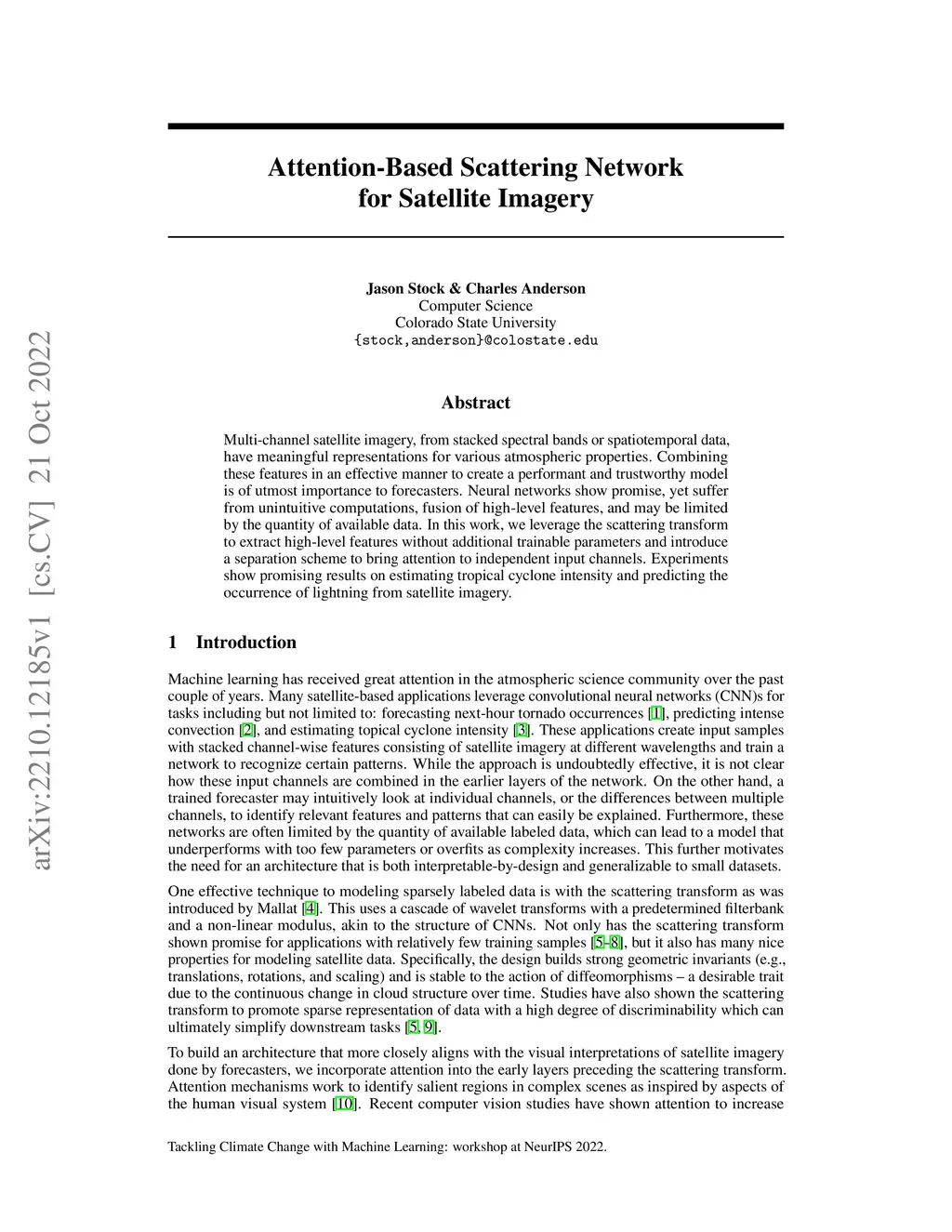 Multi-channel satellite imagery, from stacked spectral bands or spatiotemporal data, have meaningful representations for various atmospheric properties. Combining these features in an effective manner to create a performant and trustworthy model is of utmost importance to forecasters. Neural networks show promise, yet suffer from unintuitive computations, fusion of high-level features, and may be limited by the quantity of available data. In this work, we leverage the scattering transform to extract high-level features without additional trainable parameters and introduce a separation scheme to bring attention to independent input channels. Experiments show promising results on estimating tropical cyclone intensity and predicting the occurrence of lightning from satellite imagery.