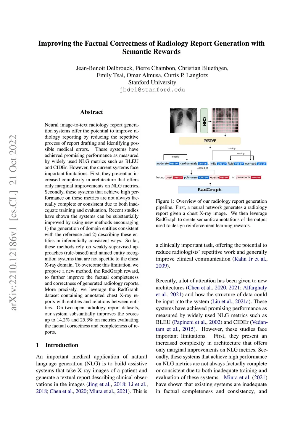 Neural image-to-text radiology report generation systems offer the potential to improve radiology reporting by reducing the repetitive process of report drafting and identifying possible medical errors. These systems have achieved promising performance as measured by widely used NLG metrics such as BLEU and CIDEr. However, the current systems face important limitations. First, they present an increased complexity in architecture that offers only marginal improvements on NLG metrics. Secondly, these systems that achieve high performance on these metrics are not always factually complete or consistent due to both inadequate training and evaluation. Recent studies have shown the systems can be substantially improved by using new methods encouraging 1) the generation of domain entities consistent with the reference and 2) describing these entities in inferentially consistent ways. So far, these methods rely on weakly-supervised approaches (rule-based) and named entity recognition systems that are not specific to the chest X-ray domain. To overcome this limitation, we propose a new method, the RadGraph reward, to further improve the factual completeness and correctness of generated radiology reports. More precisely, we leverage the RadGraph dataset containing annotated chest X-ray reports with entities and relations between entities. On two open radiology report datasets, our system substantially improves the scores up to 14.2% and 25.3% on metrics evaluating the factual correctness and completeness of reports.
