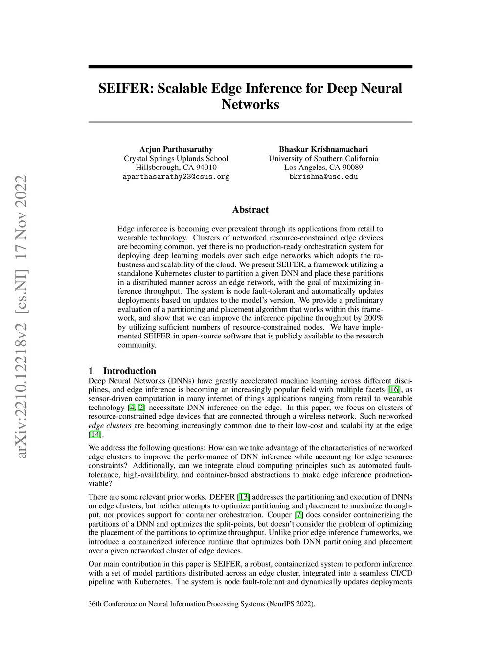 Edge inference is becoming ever prevalent through its applications from retail to wearable technology. Clusters of networked resource-constrained edge devices are becoming common, yet there is no production-ready orchestration system for deploying deep learning models over such edge networks which adopts the robustness and scalability of the cloud. We present SEIFER, a framework utilizing a standalone Kubernetes cluster to partition a given DNN and place these partitions in a distributed manner across an edge network, with the goal of maximizing inference throughput. The system is node fault-tolerant and automatically updates deployments based on updates to the model's version. We provide a preliminary evaluation of a partitioning and placement algorithm that works within this framework, and show that we can improve the inference pipeline throughput by 200% by utilizing sufficient numbers of resource-constrained nodes. We have implemented SEIFER in open-source software that is publicly available to the research community.