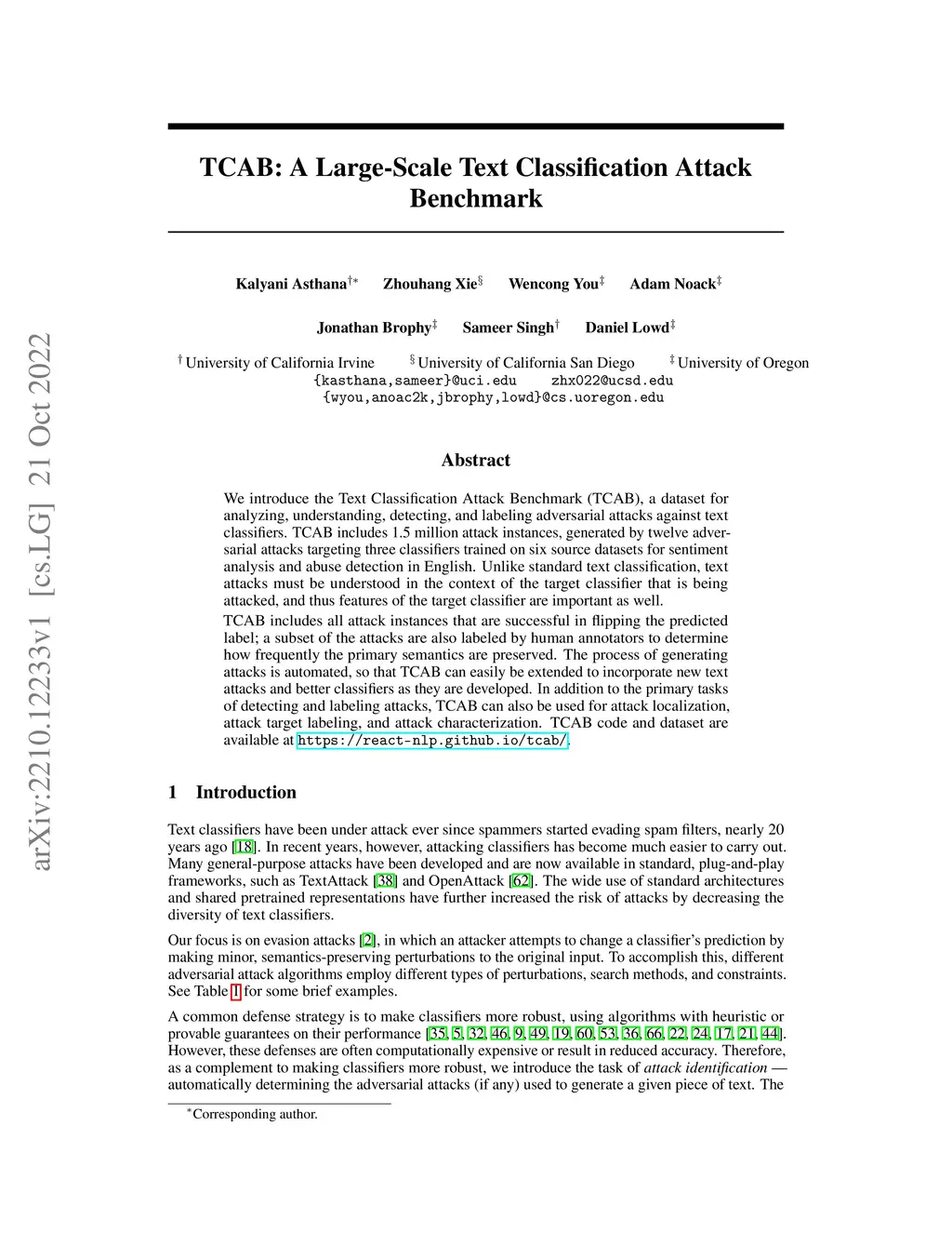 We introduce the Text Classification Attack Benchmark (TCAB), a dataset for analyzing, understanding, detecting, and labeling adversarial attacks against text classifiers. TCAB includes 1.5 million attack instances, generated by twelve adversarial attacks targeting three classifiers trained on six source datasets for sentiment analysis and abuse detection in English. Unlike standard text classification, text attacks must be understood in the context of the target classifier that is being attacked, and thus features of the target classifier are important as well. TCAB includes all attack instances that are successful in flipping the predicted label; a subset of the attacks are also labeled by human annotators to determine how frequently the primary semantics are preserved. The process of generating attacks is automated, so that TCAB can easily be extended to incorporate new text attacks and better classifiers as they are developed. In addition to the primary tasks of detecting and labeling attacks, TCAB can also be used for attack localization, attack target labeling, and attack characterization. TCAB code and dataset are available at https://react-nlp.github.io/tcab/.