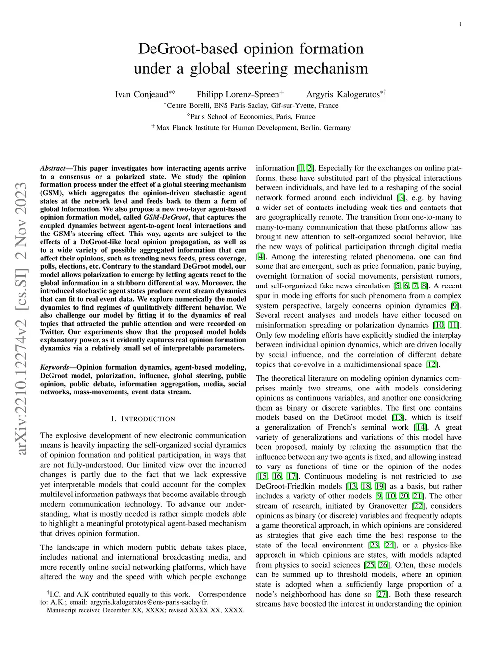 This paper investigates how interacting agents arrive to a consensus or a polarized state. We study the opinion formation process under the effect of a global steering mechanism (GSM), which aggregates the opinion-driven stochastic agent states at the network level and feeds back to them a form of global information. We also propose a new two-layer agent-based opinion formation model, called GSM-DeGroot, that captures the coupled dynamics between agent-to-agent local interactions and the GSM's steering effect. This way, agents are subject to the effects of a DeGroot-like local opinion propagation, as well as to a wide variety of possible aggregated information that can affect their opinions, such as trending news feeds, press coverage, polls, elections, etc. Contrary to the standard DeGroot model, our model allows polarization to emerge by letting agents react to the global information in a stubborn differential way. Moreover, the introduced stochastic agent states produce event stream dynamics that can fit to real event data. We explore numerically the model dynamics to find regimes of qualitatively different behavior. We also challenge our model by fitting it to the dynamics of real topics that attracted the public attention and were recorded on Twitter. Our experiments show that the proposed model holds explanatory power, as it evidently captures real opinion formation dynamics via a relatively small set of interpretable parameters.