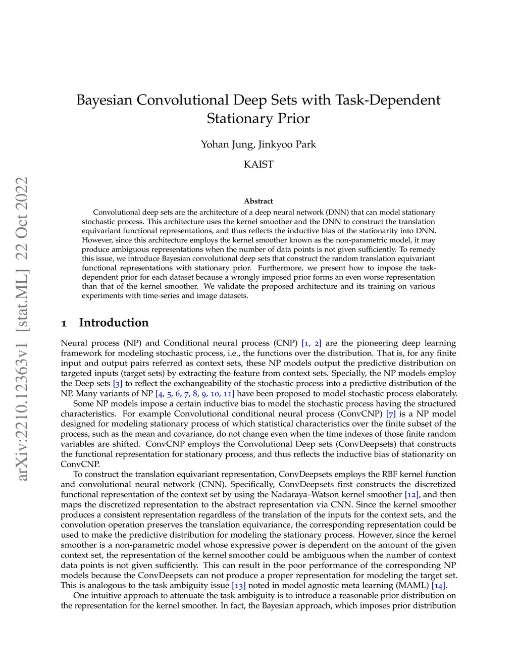 Convolutional deep sets are the architecture of a deep neural network (DNN) that can model stationary stochastic process. This architecture uses the kernel smoother and the DNN to construct the translation equivariant functional representations, and thus reflects the inductive bias of the stationarity into DNN. However, since this architecture employs the kernel smoother known as the non-parametric model, it may produce ambiguous representations when the number of data points is not given sufficiently. To remedy this issue, we introduce Bayesian convolutional deep sets that construct the random translation equivariant functional representations with stationary prior. Furthermore, we present how to impose the task-dependent prior for each dataset because a wrongly imposed prior forms an even worse representation than that of the kernel smoother. We validate the proposed architecture and its training on various experiments with time-series and image datasets.