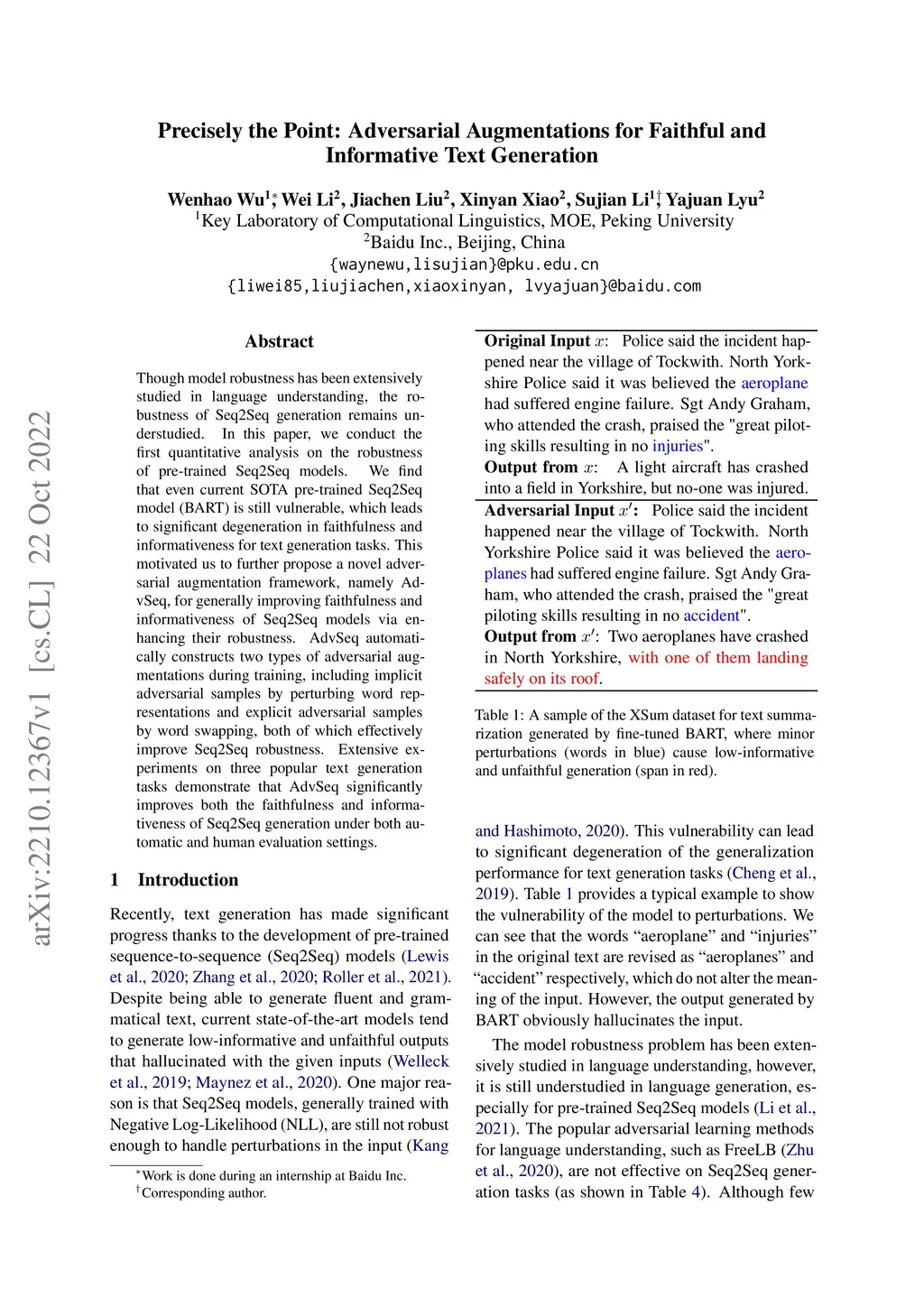 Though model robustness has been extensively studied in language understanding, the robustness of Seq2Seq generation remains understudied. In this paper, we conduct the first quantitative analysis on the robustness of pre-trained Seq2Seq models. We find that even current SOTA pre-trained Seq2Seq model (BART) is still vulnerable, which leads to significant degeneration in faithfulness and informativeness for text generation tasks. This motivated us to further propose a novel adversarial augmentation framework, namely AdvSeq, for generally improving faithfulness and informativeness of Seq2Seq models via enhancing their robustness. AdvSeq automatically constructs two types of adversarial augmentations during training, including implicit adversarial samples by perturbing word representations and explicit adversarial samples by word swapping, both of which effectively improve Seq2Seq robustness. Extensive experiments on three popular text generation tasks demonstrate that AdvSeq significantly improves both the faithfulness and informativeness of Seq2Seq generation under both automatic and human evaluation settings.