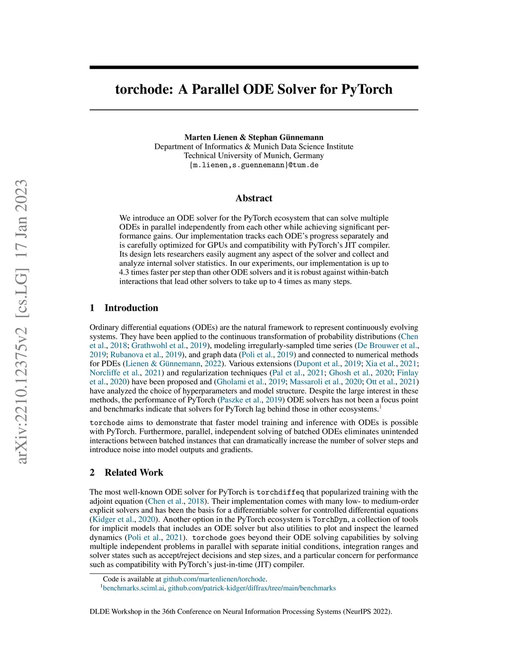 We introduce an ODE solver for the PyTorch ecosystem that can solve multiple ODEs in parallel independently from each other while achieving significant performance gains. Our implementation tracks each ODE's progress separately and is carefully optimized for GPUs and compatibility with PyTorch's JIT compiler. Its design lets researchers easily augment any aspect of the solver and collect and analyze internal solver statistics. In our experiments, our implementation is up to 4.3 times faster per step than other ODE solvers and it is robust against within-batch interactions that lead other solvers to take up to 4 times as many steps. Code available at https://github.com/martenlienen/torchode