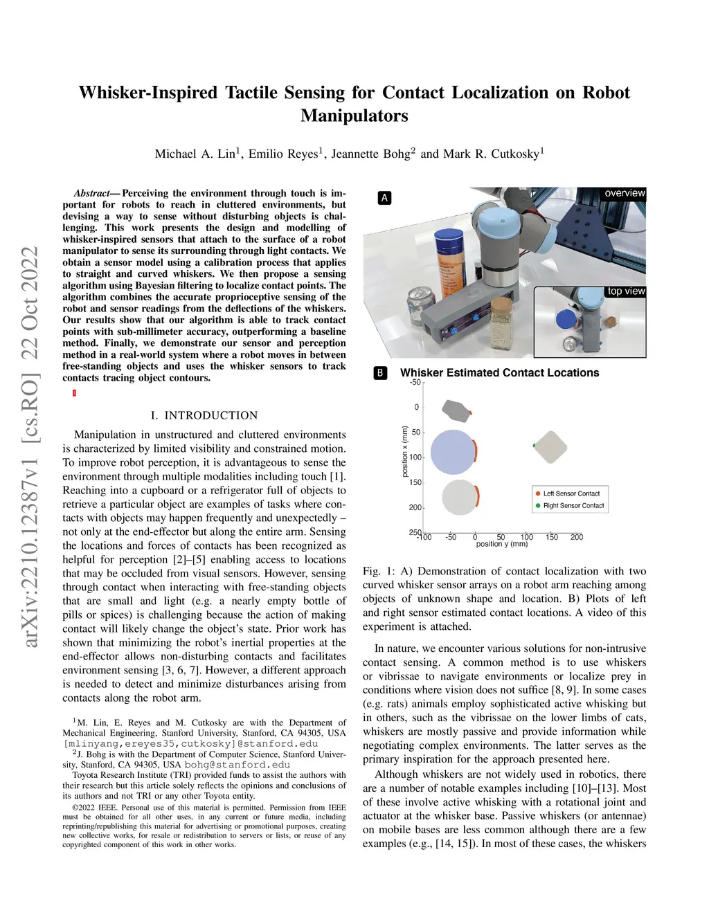 Perceiving the environment through touch is important for robots to reach in cluttered environments, but devising a way to sense without disturbing objects is challenging. This work presents the design and modelling of whisker-inspired sensors that attach to the surface of a robot manipulator to sense its surrounding through light contacts. We obtain a sensor model using a calibration process that applies to straight and curved whiskers. We then propose a sensing algorithm using Bayesian filtering to localize contact points. The algorithm combines the accurate proprioceptive sensing of the robot and sensor readings from the deflections of the whiskers. Our results show that our algorithm is able to track contact points with sub-millimeter accuracy, outperforming a baseline method. Finally, we demonstrate our sensor and perception method in a real-world system where a robot moves in between free-standing objects and uses the whisker sensors to track contacts tracing object contours.