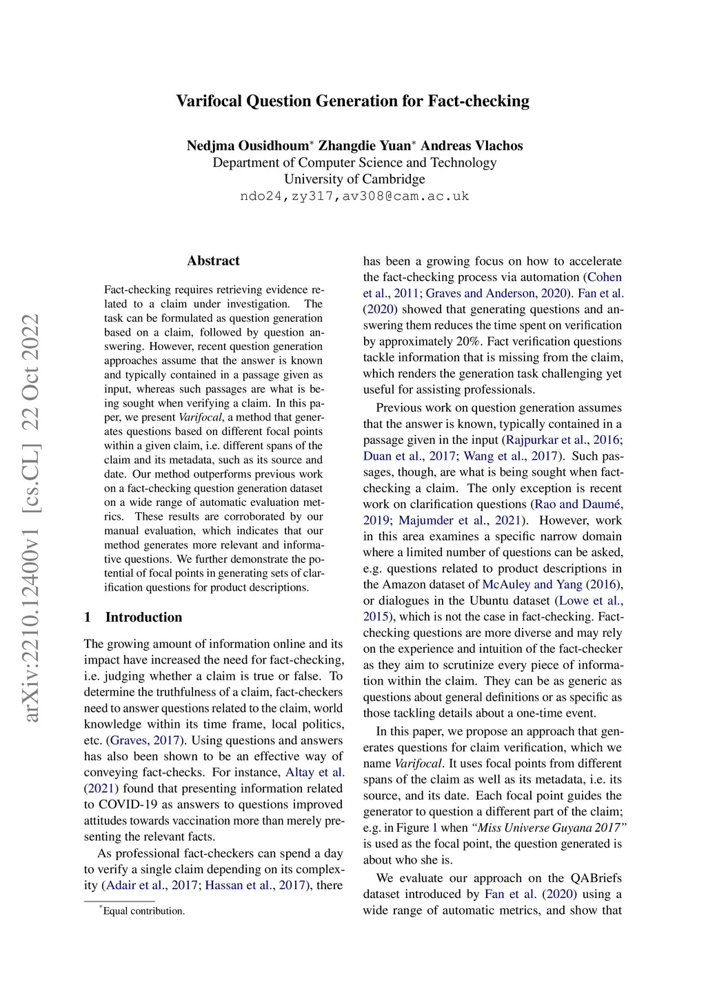 Fact-checking requires retrieving evidence related to a claim under investigation. The task can be formulated as question generation based on a claim, followed by question answering. However, recent question generation approaches assume that the answer is known and typically contained in a passage given as input, whereas such passages are what is being sought when verifying a claim. In this paper, we present {\it Varifocal}, a method that generates questions based on different focal points within a given claim, i.e.\ different spans of the claim and its metadata, such as its source and date. Our method outperforms previous work on a fact-checking question generation dataset on a wide range of automatic evaluation metrics. These results are corroborated by our manual evaluation, which indicates that our method generates more relevant and informative questions. We further demonstrate the potential of focal points in generating sets of clarification questions for product descriptions.