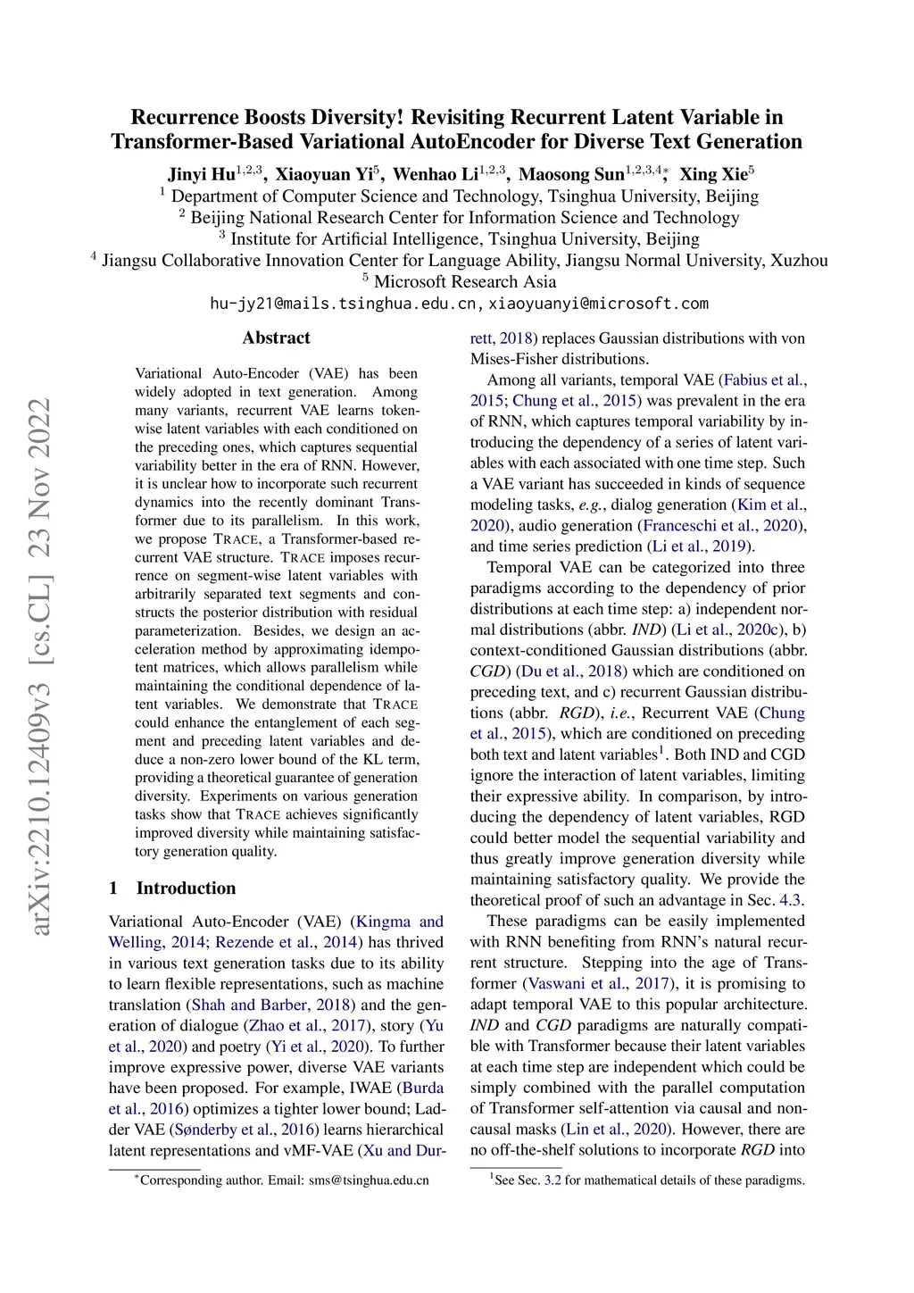 Variational Auto-Encoder (VAE) has been widely adopted in text generation. Among many variants, recurrent VAE learns token-wise latent variables with each conditioned on the preceding ones, which captures sequential variability better in the era of RNN. However, it is unclear how to incorporate such recurrent dynamics into the recently dominant Transformer due to its parallelism. In this work, we propose TRACE, a Transformer-based recurrent VAE structure. TRACE imposes recurrence on segment-wise latent variables with arbitrarily separated text segments and constructs the posterior distribution with residual parameterization. Besides, we design an acceleration method by approximating idempotent matrices, which allows parallelism while maintaining the conditional dependence of latent variables. We demonstrate that TRACE could enhance the entanglement of each segment and preceding latent variables and deduce a non-zero lower bound of the KL term, providing a theoretical guarantee of generation diversity. Experiments on two unconditional and one conditional generation tasks show that TRACE achieves significantly improved diversity while maintaining satisfactory generation quality.