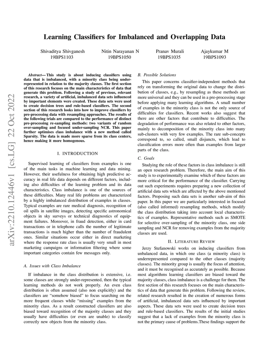This study is about inducing classifiers using data that is imbalanced, with a minority class being under-represented in relation to the majority classes. The first section of this research focuses on the main characteristics of data that generate this problem. Following a study of previous, relevant research, a variety of artificial, imbalanced data sets influenced by important elements were created. These data sets were used to create decision trees and rule-based classifiers. The second section of this research looks into how to improve classifiers by pre-processing data with resampling approaches. The results of the following trials are compared to the performance of distinct pre-processing re-sampling methods: two variants of random over-sampling and focused under-sampling NCR. This paper further optimises class imbalance with a new method called Sparsity. The data is made more sparse from its class centers, hence making it more homogenous.
