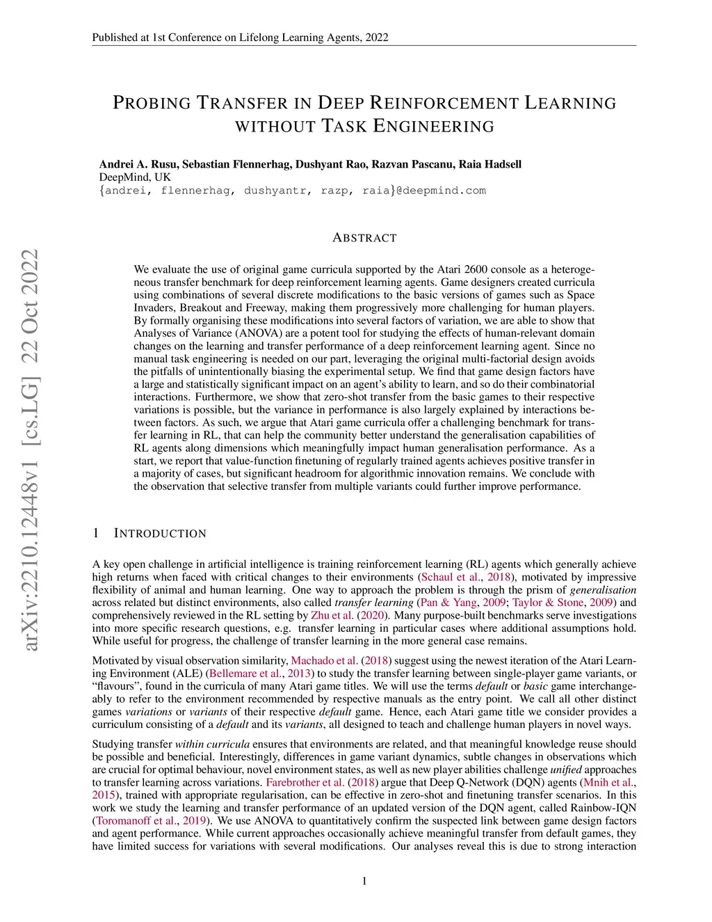 We evaluate the use of original game curricula supported by the Atari 2600 console as a heterogeneous transfer benchmark for deep reinforcement learning agents. Game designers created curricula using combinations of several discrete modifications to the basic versions of games such as Space Invaders, Breakout and Freeway, making them progressively more challenging for human players. By formally organising these modifications into several factors of variation, we are able to show that Analyses of Variance (ANOVA) are a potent tool for studying the effects of human-relevant domain changes on the learning and transfer performance of a deep reinforcement learning agent. Since no manual task engineering is needed on our part, leveraging the original multi-factorial design avoids the pitfalls of unintentionally biasing the experimental setup. We find that game design factors have a large and statistically significant impact on an agent's ability to learn, and so do their combinatorial interactions. Furthermore, we show that zero-shot transfer from the basic games to their respective variations is possible, but the variance in performance is also largely explained by interactions between factors. As such, we argue that Atari game curricula offer a challenging benchmark for transfer learning in RL, that can help the community better understand the generalisation capabilities of RL agents along dimensions which meaningfully impact human generalisation performance. As a start, we report that value-function finetuning of regularly trained agents achieves positive transfer in a majority of cases, but significant headroom for algorithmic innovation remains. We conclude with the observation that selective transfer from multiple variants could further improve performance.