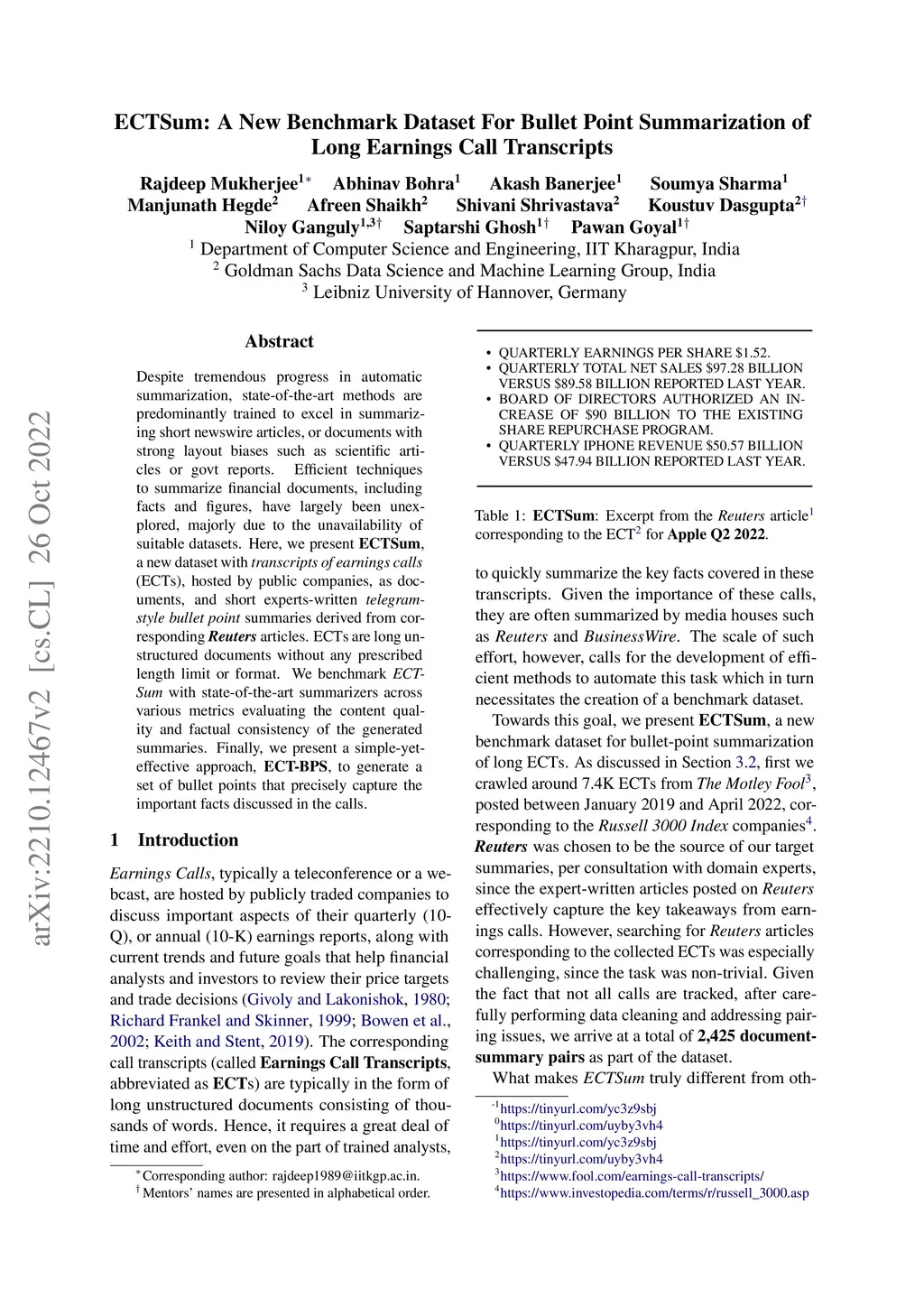 Despite tremendous progress in automatic summarization, state-of-the-art methods are predominantly trained to excel in summarizing short newswire articles, or documents with strong layout biases such as scientific articles or government reports. Efficient techniques to summarize financial documents, including facts and figures, have largely been unexplored, majorly due to the unavailability of suitable datasets. In this work, we present ECTSum, a new dataset with transcripts of earnings calls (ECTs), hosted by publicly traded companies, as documents, and short experts-written telegram-style bullet point summaries derived from corresponding Reuters articles. ECTs are long unstructured documents without any prescribed length limit or format. We benchmark our dataset with state-of-the-art summarizers across various metrics evaluating the content quality and factual consistency of the generated summaries. Finally, we present a simple-yet-effective approach, ECT-BPS, to generate a set of bullet points that precisely capture the important facts discussed in the calls.