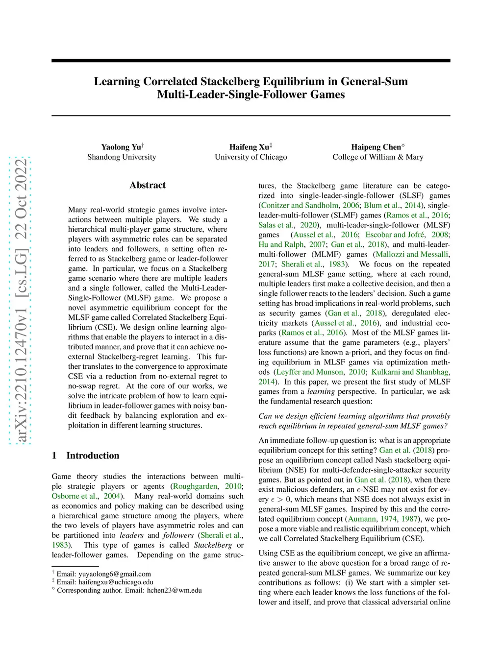 Many real-world strategic games involve interactions between multiple players. We study a hierarchical multi-player game structure, where players with asymmetric roles can be separated into leaders and followers, a setting often referred to as Stackelberg game or leader-follower game. In particular, we focus on a Stackelberg game scenario where there are multiple leaders and a single follower, called the Multi-Leader-Single-Follower (MLSF) game. We propose a novel asymmetric equilibrium concept for the MLSF game called Correlated Stackelberg Equilibrium (CSE). We design online learning algorithms that enable the players to interact in a distributed manner, and prove that it can achieve no-external Stackelberg-regret learning. This further translates to the convergence to approximate CSE via a reduction from no-external regret to no-swap regret. At the core of our works, we solve the intricate problem of how to learn equilibrium in leader-follower games with noisy bandit feedback by balancing exploration and exploitation in different learning structures.