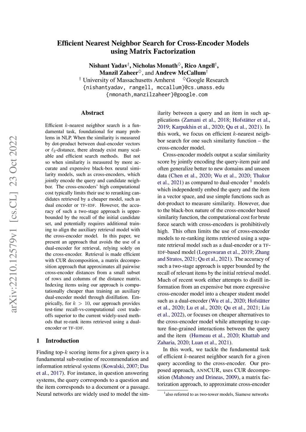 Efficient Nearest Neighbor Search for Cross-Encoder Models using Matrix