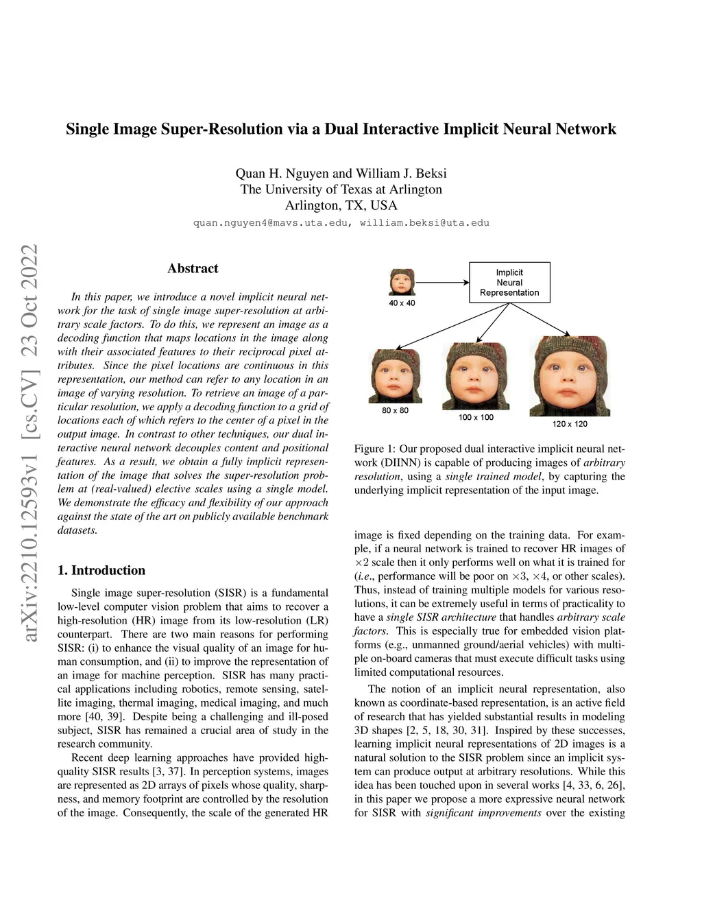 In this paper, we introduce a novel implicit neural network for the task of single image super-resolution at arbitrary scale factors. To do this, we represent an image as a decoding function that maps locations in the image along with their associated features to their reciprocal pixel attributes. Since the pixel locations are continuous in this representation, our method can refer to any location in an image of varying resolution. To retrieve an image of a particular resolution, we apply a decoding function to a grid of locations each of which refers to the center of a pixel in the output image. In contrast to other techniques, our dual interactive neural network decouples content and positional features. As a result, we obtain a fully implicit representation of the image that solves the super-resolution problem at (real-valued) elective scales using a single model. We demonstrate the efficacy and flexibility of our approach against the state of the art on publicly available benchmark datasets.